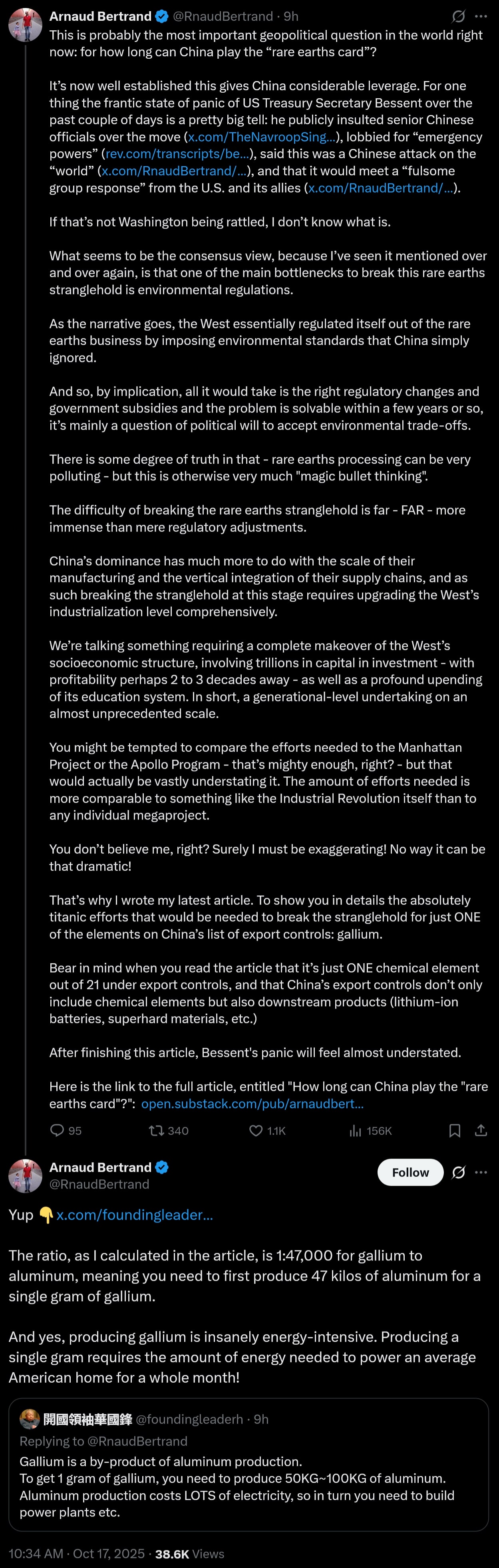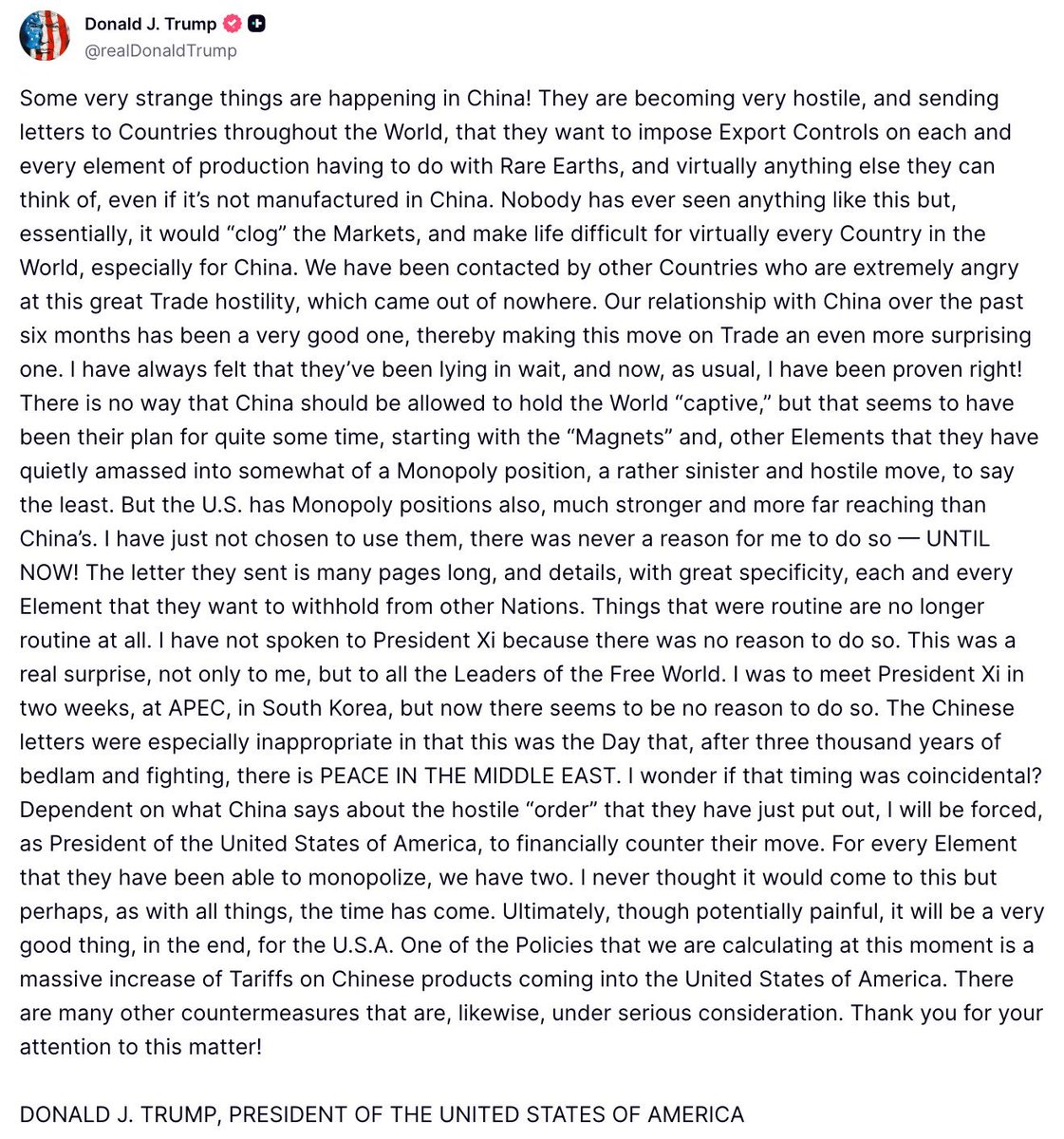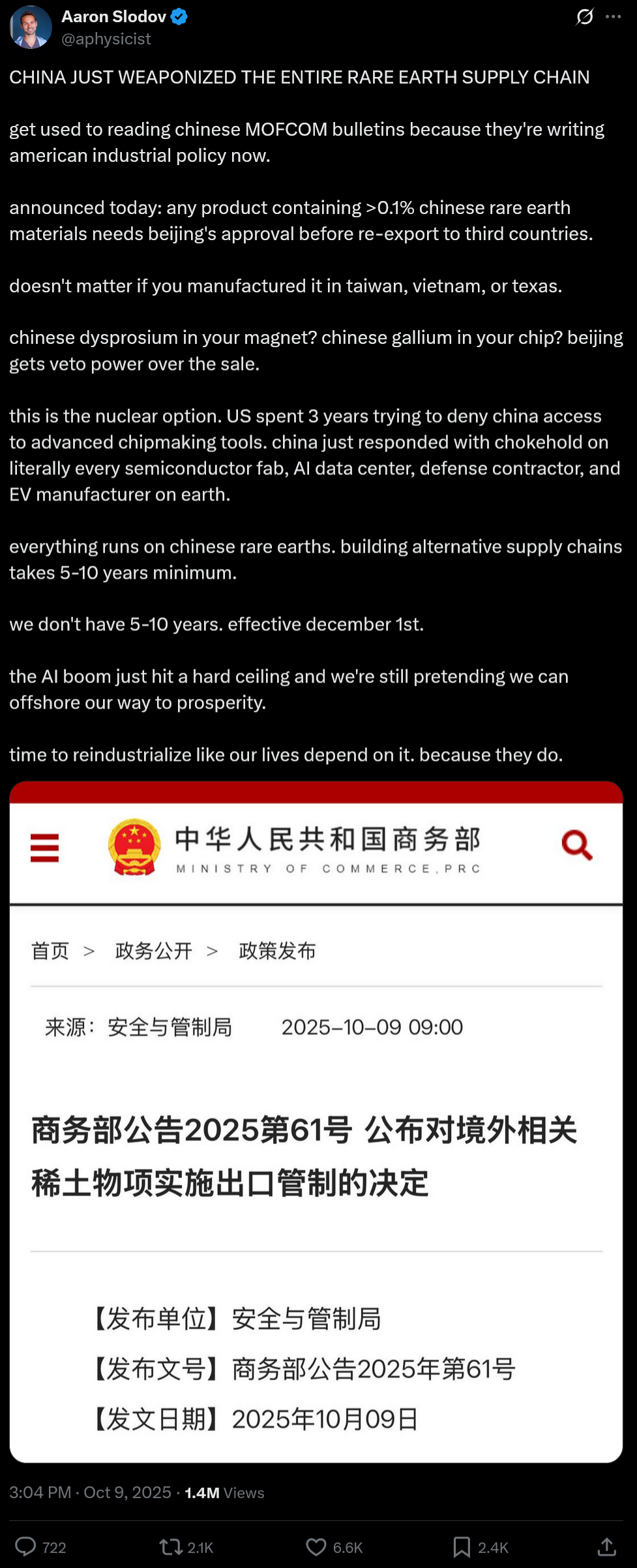 https://archive.ph/uNn0L>China expands rare earth export restrictions ahead of possible Trump-Xi meeting>China has tightened export controls on rare earths and related technologies while barring its citizens from participating in unauthorized mining overseas, adding fresh strains to a sector central to its geopolitical leverage.>Foreign entities must now obtain a license from Beijing to export any products containing over 0.1% of domestically-sourced rare earths, or manufactured using China’s extraction, refining, magnet-making or recycling technology, the Ministry of Commerce said Thursday.>To prevent the “misuse” of rare-earth minerals in the military and other sensitive sectors, companies tied to foreign militaries or placed on export-control or watch lists will be denied permits, the commerce ministry said. Applications for items that could be used in weaponry, terrorism or other military purposes will also be rejected.>The latest move marks a “major upgrade for rare earth export control,” expanding restrictions from only raw materials to intellectual property and technologies, said Dan Wang, China director at Eurasia Group. China added several rare earths and related materials to its export control list in April.>These restrictions could further deepen other countries’ dependence on Chinese know-how while supporting Beijing’s efforts to move its own industries up the value chain, Wang added.>Chinese citizens are also prohibited from supporting overseas activities related to rare earth extraction and magnet manufacturing without approval from Beijing.>The new rules on the export of rare earth materials will take effect on December 1, while those on technologies and labor took effect immediately, according to official statements.>Applications for rare earth exports used in producing sub-14 nanometer semiconductors, advanced memory chips, semiconductor manufacturing or testing equipment, or artificial intelligence with potential military applications will be reviewed on a case-by-case basis, the ministry said.>The measures mainly target the defense sector, said George Chen, partner at The Asia Group, as part of Beijing’s efforts to dwarf the U.S. defense capabilities.>Rare earths are critical to high-tech industries, including automobiles, defense and semiconductors. Tightened access to rare earths has disrupted international supply chains caught in the U.S.-China crossfire this year.>“Beijing has realized that it has leverage in this sector and is clearly not shy about using it,” said Wendy Cutler, a senior vice president at the Asia Society Policy Institute and former U.S. trade negotiator. The move could pressure Washington to make further concessions in ongoing talks, such as tariff reductions or relaxed U.S. export controls.>Bargaining leverages>China accounts for about 70% of the global supply and has repeatedly used the critically needed minerals as a bargaining chip in trade discussions.>The latest restrictions came just weeks before a potential meeting between U.S. President Donald Trump and his Chinese counterpart Xi Jinping. The two leaders are expected to meet in person on the sidelines of the Asia-Pacific Economic Cooperation forum during the last week of October in Gyeongju, South Korea.>While China has been silent on future meetings, Trump had also said he would visit China early next year and that Xi would come to the U.S. at a later date.>The new announcement can be viewed as “a series of bargains” that Beijing wants to place even before the next round of major trade talks, The Asia Group’s Chen said.>“The Chinese side is getting more and more experienced in dealing with their counterparts and they know what their American friends want,” Chen added.>Since late last year, China has tightened restrictions on rare earth exports, including demanding proof that they will not be used for military purposes. Beijing started issuing single-use export licenses following a trade truce with Washington in May.>While China’s official data showed that exports of rare earth magnets have recovered in recent months, progress appeared uneven. The European Chamber of Commerce said in a survey released last month that Beijing’s tight grip had cost at least one member “millions of euros” while other members cited inconsistent procedures for obtaining export approvals.>A Chinese ministry spokesperson on Thursday said that there would be certain exemptions under the new rules, including exports for emergency medical situations or disaster relief. A “transition period” will also allow businesses to fulfill existing contracts and meet compliance requirements.>The transition window is likely to cushion some near-term impacts for companies, Eurasia’s Wang said, noting that “similar to how the U.S. tech export ban to China left room for American tech companies to lobby and apply for approval — most of them did get approvals.”>“It will give China more power than just a blunt ban,” Wang said. >>2515573A post caused by ideology shopping and being terminally online. You're probably gonna adopt some anorchomonarchist LARP by the end of this year. Completely empty of theory, misunderstanding the simplest things, just trying to be edgy and against the grain.