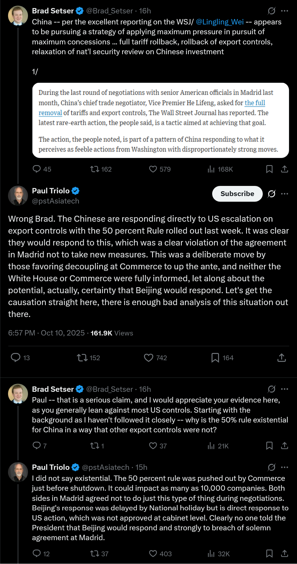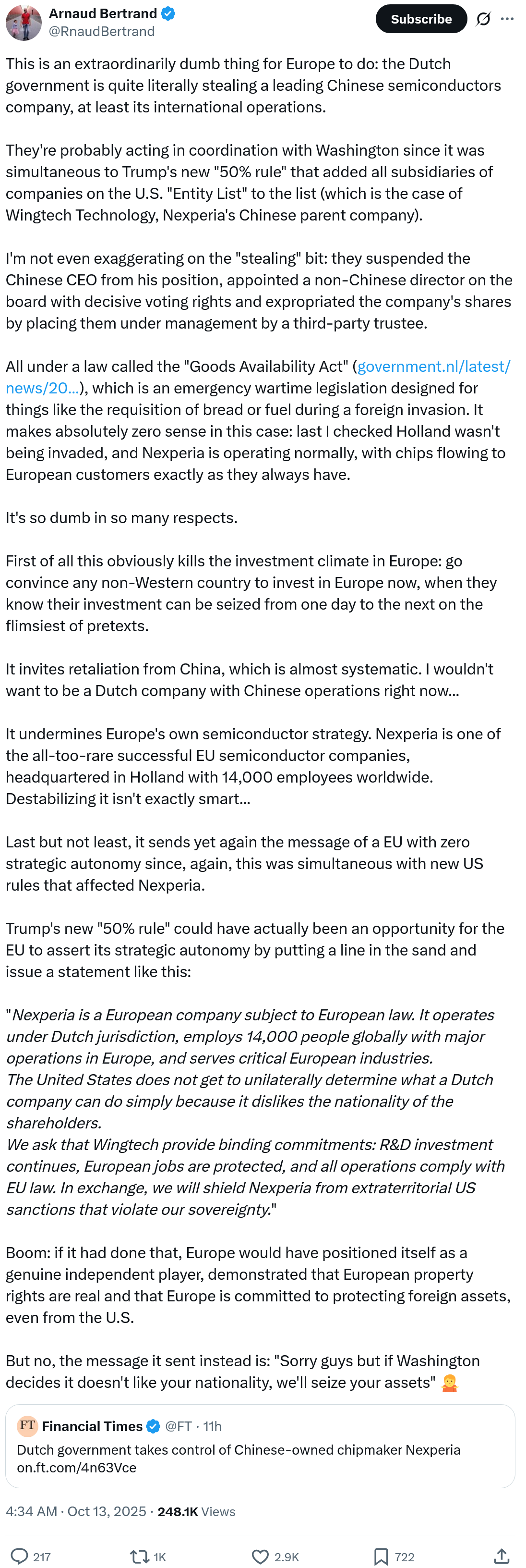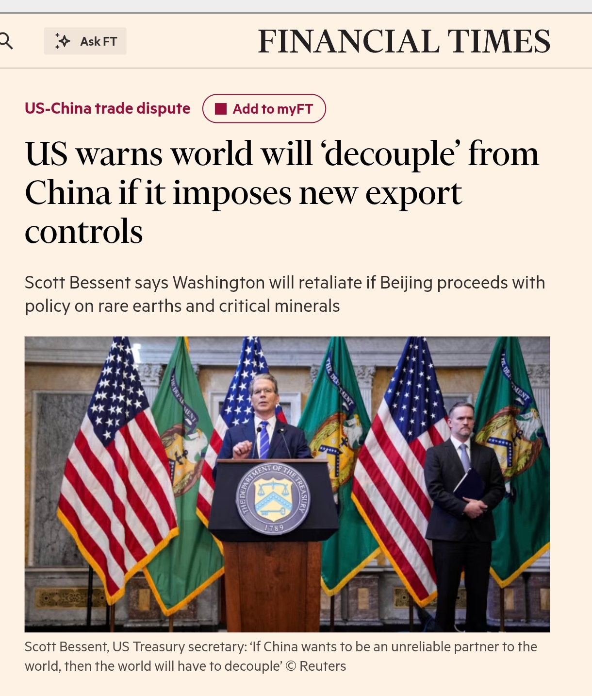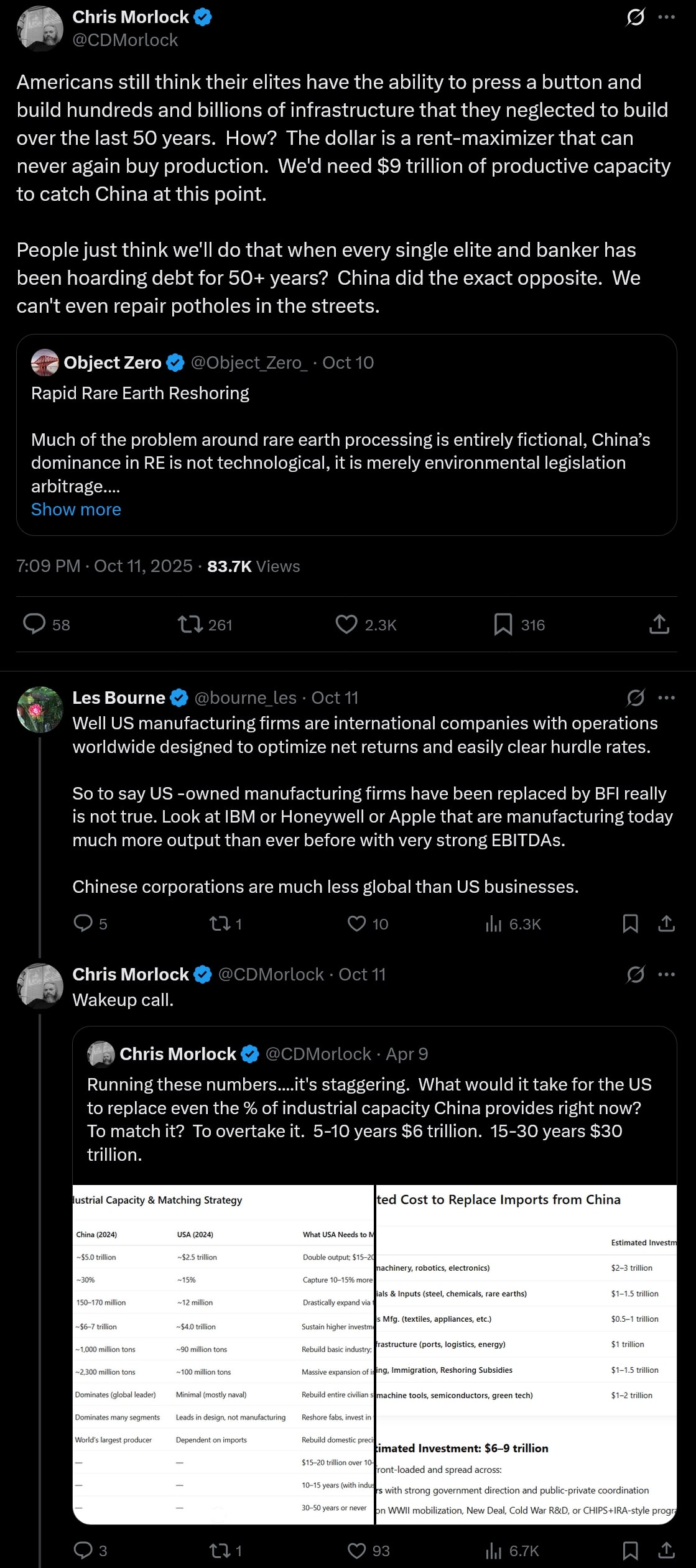 https://archive.ph/uNn0L>China expands rare earth export restrictions ahead of possible Trump-Xi meeting>China has tightened export controls on rare earths and related technologies while barring its citizens from participating in unauthorized mining overseas, adding fresh strains to a sector central to its geopolitical leverage.>Foreign entities must now obtain a license from Beijing to export any products containing over 0.1% of domestically-sourced rare earths, or manufactured using China’s extraction, refining, magnet-making or recycling technology, the Ministry of Commerce said Thursday.>To prevent the “misuse” of rare-earth minerals in the military and other sensitive sectors, companies tied to foreign militaries or placed on export-control or watch lists will be denied permits, the commerce ministry said. Applications for items that could be used in weaponry, terrorism or other military purposes will also be rejected.>The latest move marks a “major upgrade for rare earth export control,” expanding restrictions from only raw materials to intellectual property and technologies, said Dan Wang, China director at Eurasia Group. China added several rare earths and related materials to its export control list in April.>These restrictions could further deepen other countries’ dependence on Chinese know-how while supporting Beijing’s efforts to move its own industries up the value chain, Wang added.>Chinese citizens are also prohibited from supporting overseas activities related to rare earth extraction and magnet manufacturing without approval from Beijing.>The new rules on the export of rare earth materials will take effect on December 1, while those on technologies and labor took effect immediately, according to official statements.>Applications for rare earth exports used in producing sub-14 nanometer semiconductors, advanced memory chips, semiconductor manufacturing or testing equipment, or artificial intelligence with potential military applications will be reviewed on a case-by-case basis, the ministry said.>The measures mainly target the defense sector, said George Chen, partner at The Asia Group, as part of Beijing’s efforts to dwarf the U.S. defense capabilities.>Rare earths are critical to high-tech industries, including automobiles, defense and semiconductors. Tightened access to rare earths has disrupted international supply chains caught in the U.S.-China crossfire this year.>“Beijing has realized that it has leverage in this sector and is clearly not shy about using it,” said Wendy Cutler, a senior vice president at the Asia Society Policy Institute and former U.S. trade negotiator. The move could pressure Washington to make further concessions in ongoing talks, such as tariff reductions or relaxed U.S. export controls.>Bargaining leverages>China accounts for about 70% of the global supply and has repeatedly used the critically needed minerals as a bargaining chip in trade discussions.>The latest restrictions came just weeks before a potential meeting between U.S. President Donald Trump and his Chinese counterpart Xi Jinping. The two leaders are expected to meet in person on the sidelines of the Asia-Pacific Economic Cooperation forum during the last week of October in Gyeongju, South Korea.>While China has been silent on future meetings, Trump had also said he would visit China early next year and that Xi would come to the U.S. at a later date.>The new announcement can be viewed as “a series of bargains” that Beijing wants to place even before the next round of major trade talks, The Asia Group’s Chen said.>“The Chinese side is getting more and more experienced in dealing with their counterparts and they know what their American friends want,” Chen added.>Since late last year, China has tightened restrictions on rare earth exports, including demanding proof that they will not be used for military purposes. Beijing started issuing single-use export licenses following a trade truce with Washington in May.>While China’s official data showed that exports of rare earth magnets have recovered in recent months, progress appeared uneven. The European Chamber of Commerce said in a survey released last month that Beijing’s tight grip had cost at least one member “millions of euros” while other members cited inconsistent procedures for obtaining export approvals.>A Chinese ministry spokesperson on Thursday said that there would be certain exemptions under the new rules, including exports for emergency medical situations or disaster relief. A “transition period” will also allow businesses to fulfill existing contracts and meet compliance requirements.>The transition window is likely to cushion some near-term impacts for companies, Eurasia’s Wang said, noting that “similar to how the U.S. tech export ban to China left room for American tech companies to lobby and apply for approval — most of them did get approvals.”>“It will give China more power than just a blunt ban,” Wang said. >>2515573A post caused by ideology shopping and being terminally online. You're probably gonna adopt some anorchomonarchist LARP by the end of this year. Completely empty of theory, misunderstanding the simplest things, just trying to be edgy and against the grain.