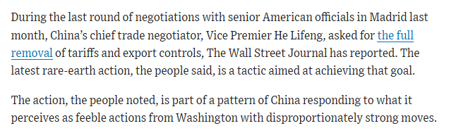 In short: Biden/Trump blocked Nvidia and ASML from exporting their chips and machines that make chips to China. China went "Oi gweilo they make chips out of our rare earths to begin with" and blocked both rare earths and the means of extracting them. Complete checkmate.