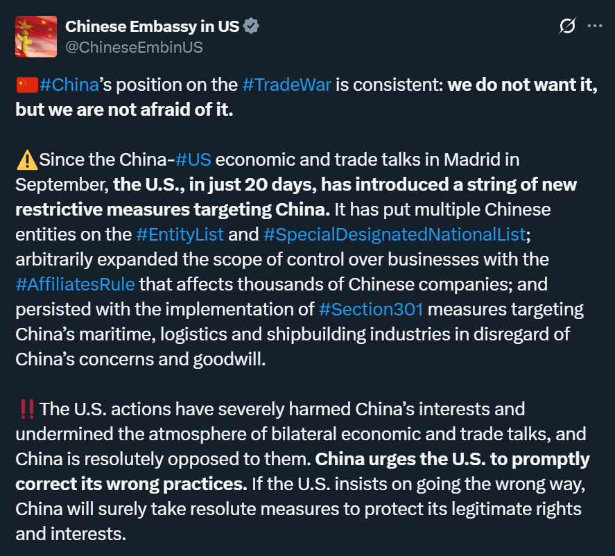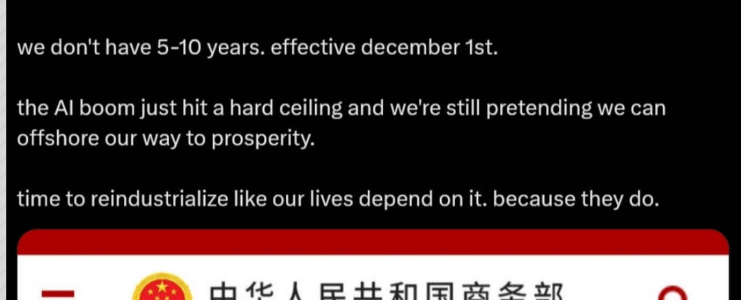 Basically China imposed additional export controls over not just rare earths but components and materials used for making machines that refine rare earths. The reason? "Threats to national security" lmao, the go-to American excuse.