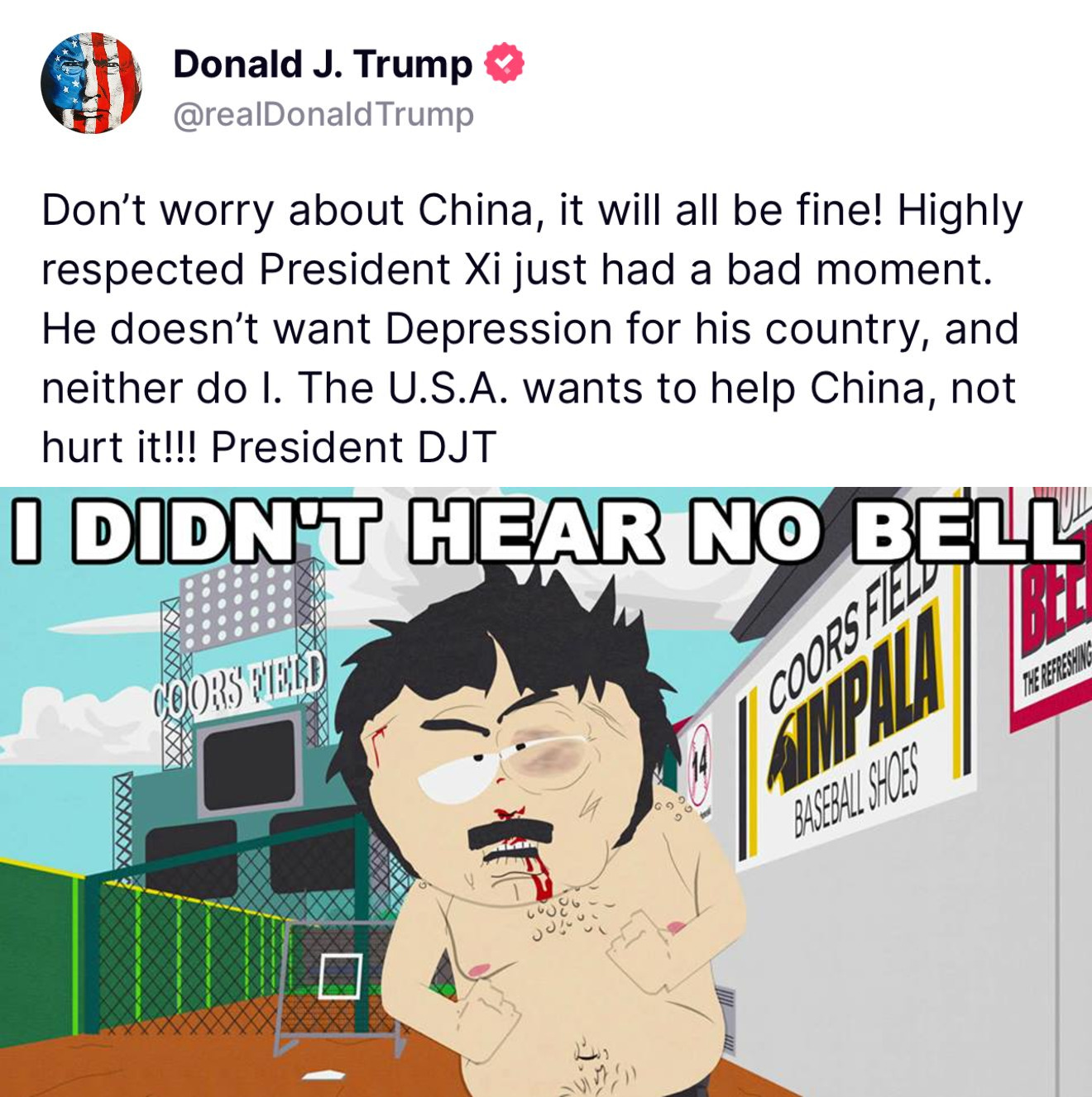 >>2515473 wasn't getting much attention in the media but then the orange pedophile posted this. He's seething. Boiling. Screeching. It's fucking hilarious, he's trying to frame it how China did this unprovoked and how his orange child raping ass is the victim.