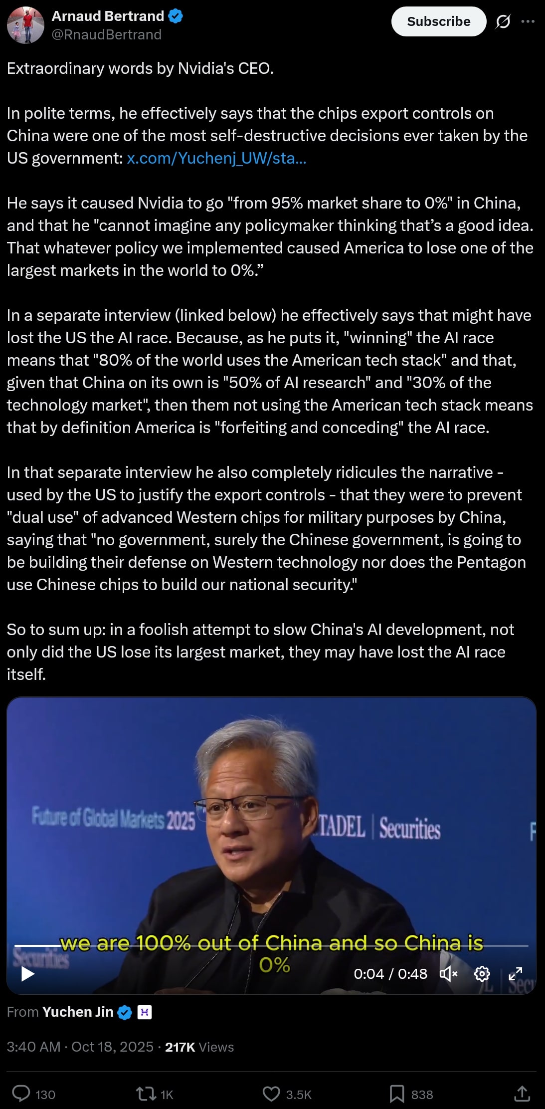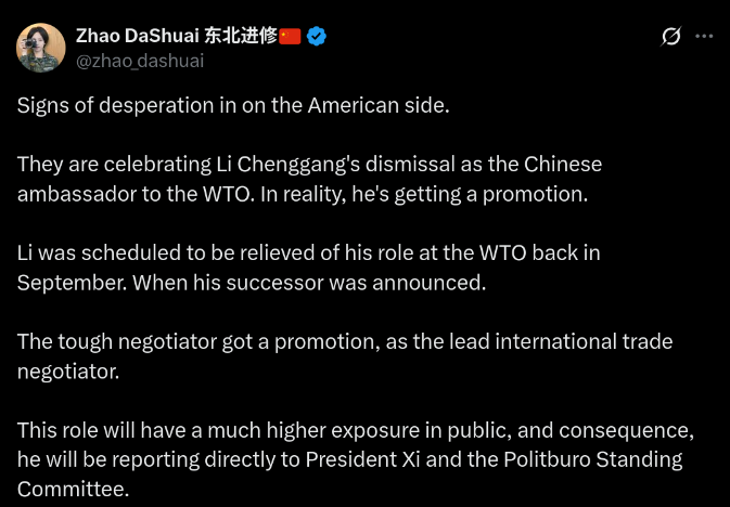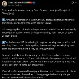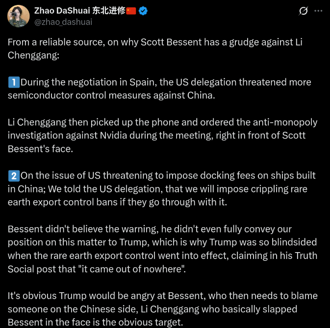 >>2523553>@zhao_dashuai>From a reliable source, on why Scott Bessent has a grudge against Li Chenggang:>During the negotiation in Spain, the US delegation threatened more semiconductor control measures against China.>Li Chenggang then picked up the phone and ordered the anti-monopoly investigation against Nvidia during the meeting, right in front of Scott Bessent's face.KNEEL
