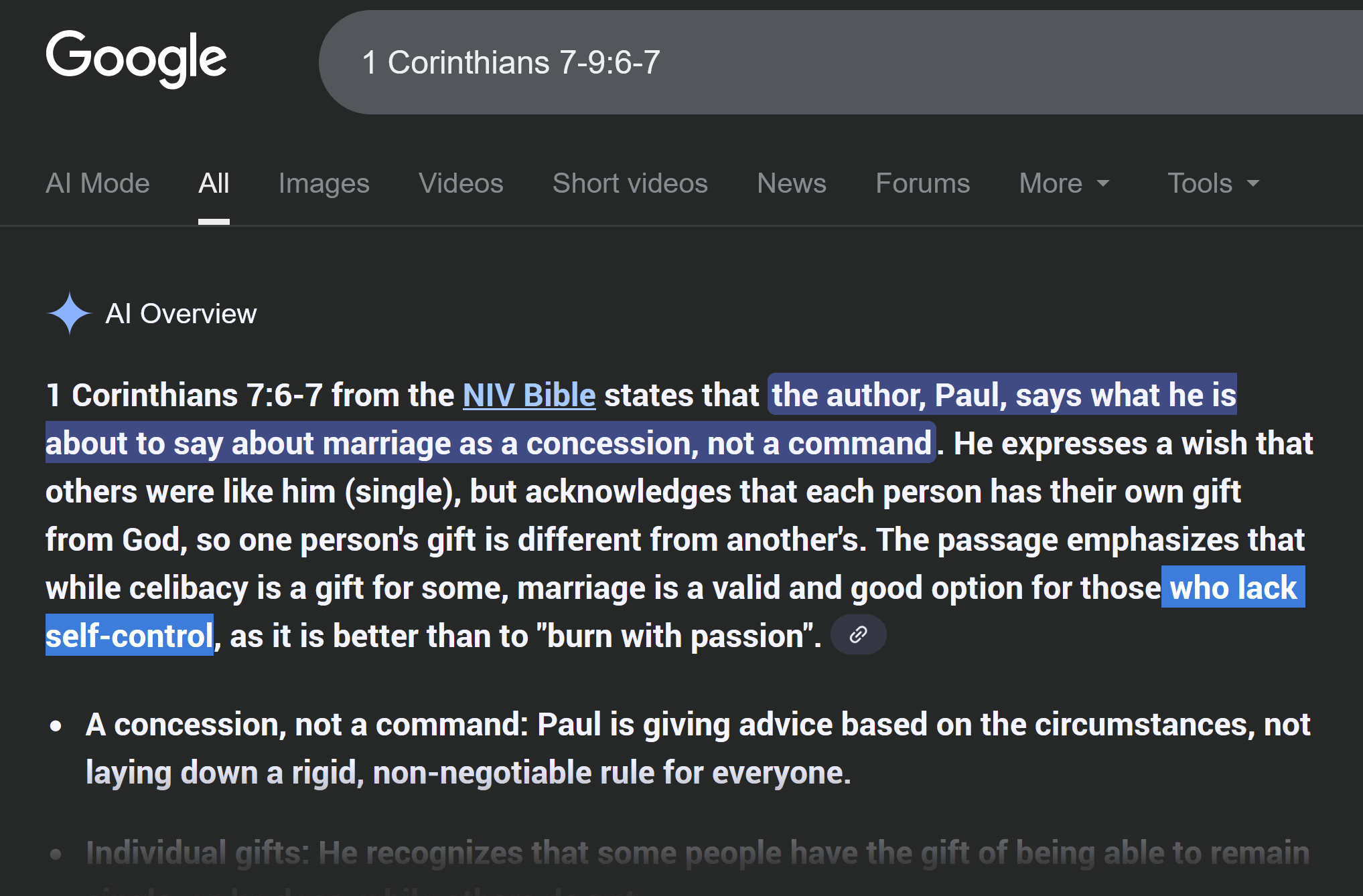 >>2529161What's your end goal? That first picrel disproves your implication that sex is a bad thing. Those who mare are good, but those who choose not are better is not the same as saying sex is bad. Still you choose to ignore the context of Christianity in the 1st century and start bringing up later doctrinal changes. Why are you so duplicitous and ignore verse 9 where the whole argument was about divorce and how jews were used to divorcing their wives on all sorts of reasons and Jesus says, No, only on adultery can you divorce and the disciples get culture shock. Jesus even before then emphasizes marriage was God's original purpose in verse 5 and 6. You know that when he was arguing with the Sadducees he said that marriage is irrelevant in heaven because everyone is like an angel. Weird hill to die on. We had this argument a couple months back and you still are pushing the whole "sex is bad" narrative. In both judaism and christianity, sex within marriage is good and legitimate and outside of that, it is whoredom (fornication). Proverbs chapter 5 is good reference for starters.