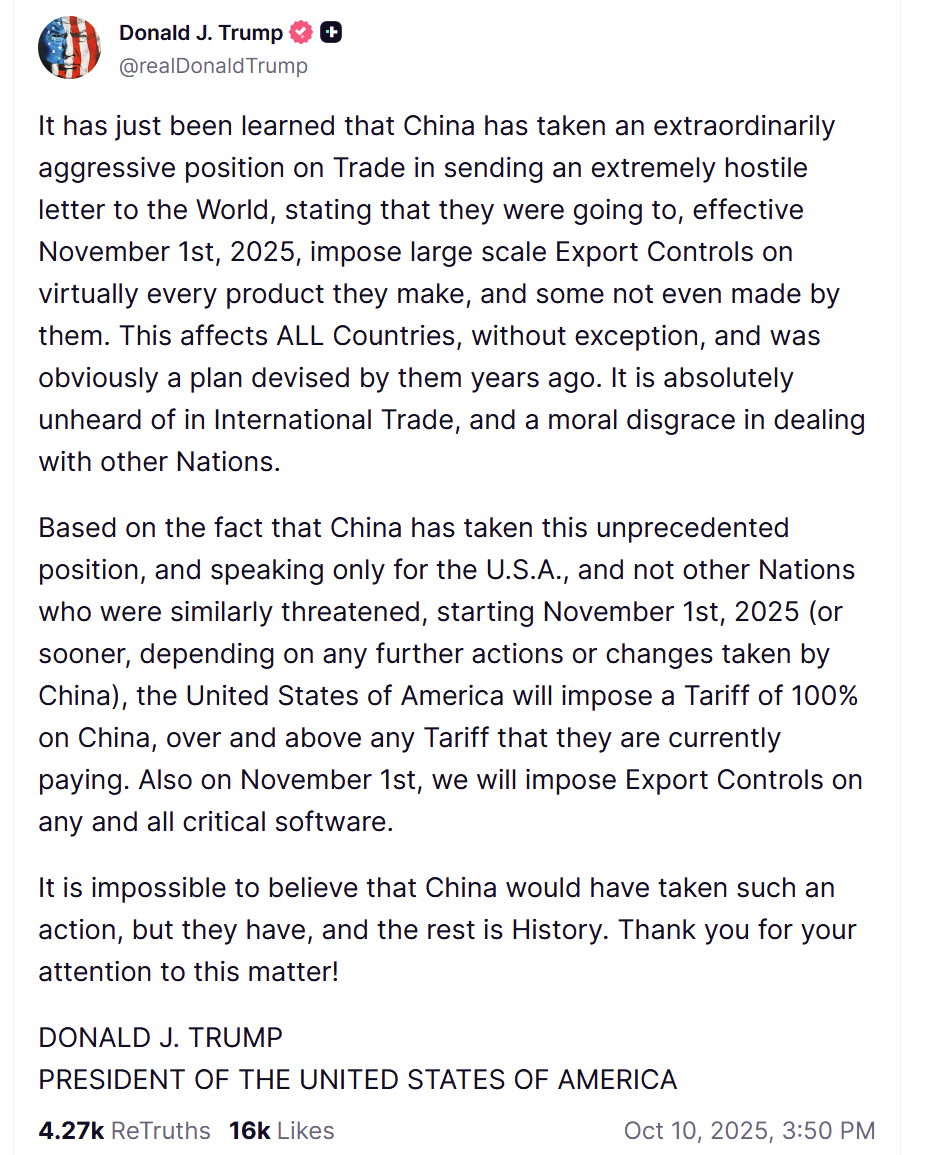 >Based on the fact that China has taken this unprecedented position, and speaking only for the U.S.A., and not other Nations who were similarly threatened, starting November 1st, 2025 (or sooner, depending on any further actions or changes taken by China), the United States of America will impose a Tariff of 100% on China, over and above any Tariff that they are currently paying. Also on November 1st, we will impose Export Controls on any and all critical software.