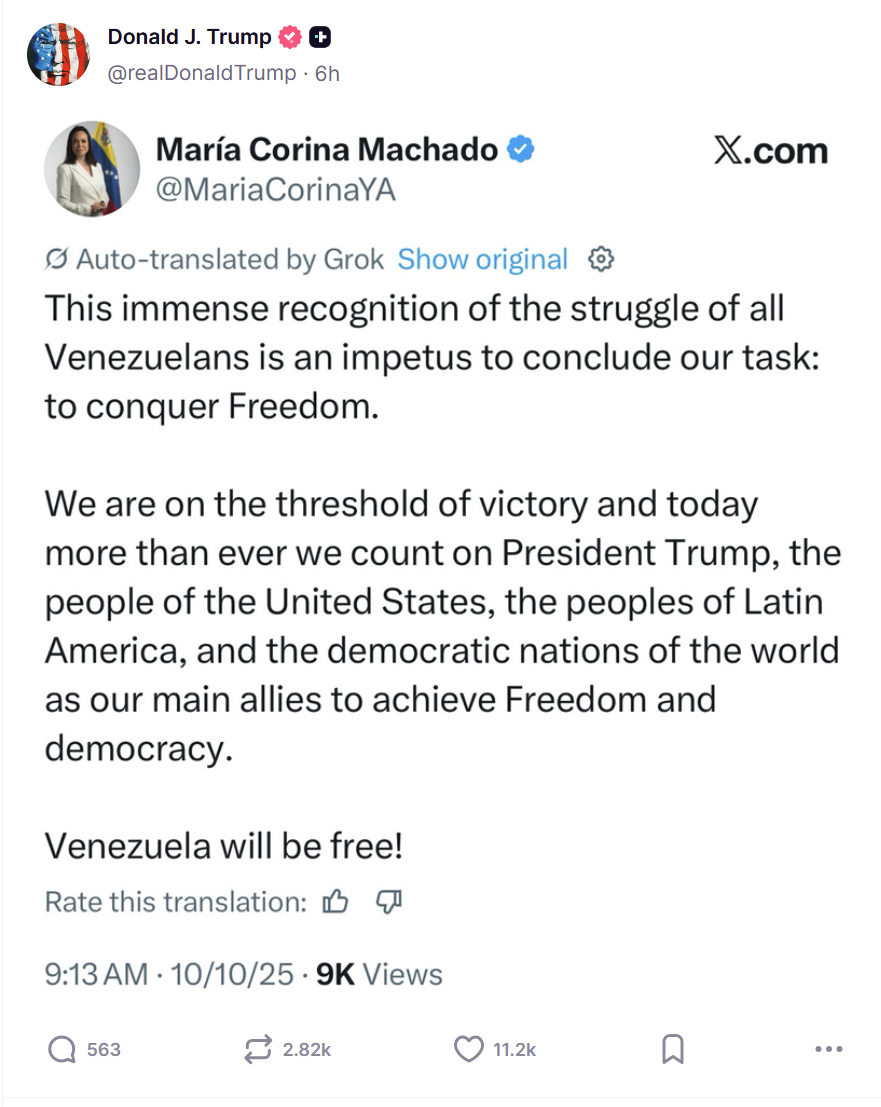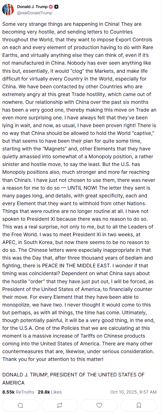 >Some very strange things are happening in China! They are becoming very hostile, and sending letters to Countries throughout the World, that they want to impose Export Controls on each and every element of production having to do with Rare Earths, and virtually anything else they can think of, even if it’s not manufactured in China. Nobody has ever seen anything like this but, essentially, it would “clog” the Markets, and make life difficult for virtually every Country in the World, especially for China. We have been contacted by other Countries who are extremely angry at this great Trade hostility, which came out of nowhere. Our relationship with China over the past six months has been a very good one, thereby making this move on Trade an even more surprising one. I have always felt that they’ve been lying in wait, and now, as usual, I have been proven right! There is no way that China should be allowed to hold the World “captive,” but that seems to have been their plan for quite some time, starting with the “Magnets” and, other Elements that they have quietly amassed into somewhat of a Monopoly position, a rather sinister and hostile move, to say the least. But the U.S. has Monopoly positions also, much stronger and more far reaching than China’s. I have just not chosen to use them, there was never a reason for me to do so — UNTIL NOW! The letter they sent is many pages long, and details, with great specificity, each and every Element that they want to withhold from other Nations. Things that were routine are no longer routine at all. I have not spoken to President Xi because there was no reason to do so. This was a real surprise, not only to me, but to all the Leaders of the Free World. I was to meet President Xi in two weeks, at APEC, in South Korea, but now there seems to be no reason to do so. The Chinese letters were especially inappropriate in that this was the Day that, after three thousand years of bedlam and fighting, there is PEACE IN THE MIDDLE EAST. I wonder if that timing was coincidental? Dependent on what China says about the hostile “order” that they have just put out, I will be forced, as President of the United States of America, to financially counter their move. For every Element that they have been able to monopolize, we have two. I never thought it would come to this but perhaps, as with all things, the time has come. Ultimately, though potentially painful, it will be a very good thing, in the end, for the U.S.A. One of the Policies that we are calculating at this moment is a massive increase of Tariffs on Chinese products coming into the United States of America. There are many other countermeasures that are, likewise, under serious consideration. Thank you for your attention to this matter!