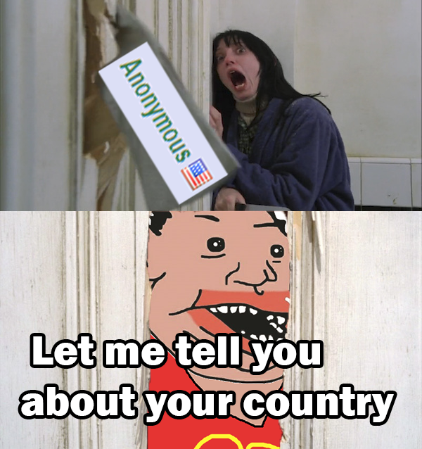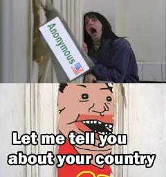 >Let me tell you about your county!But they all do that about America all day and I don't even think they realize it because in their minds they think they actually CAN tell us about America! because they consume so much American media and news that they think they're actually American or something.