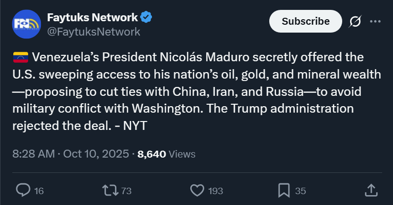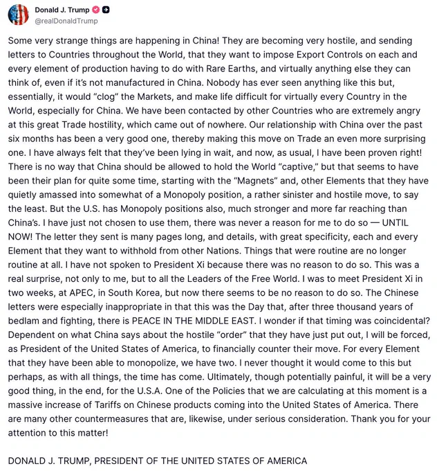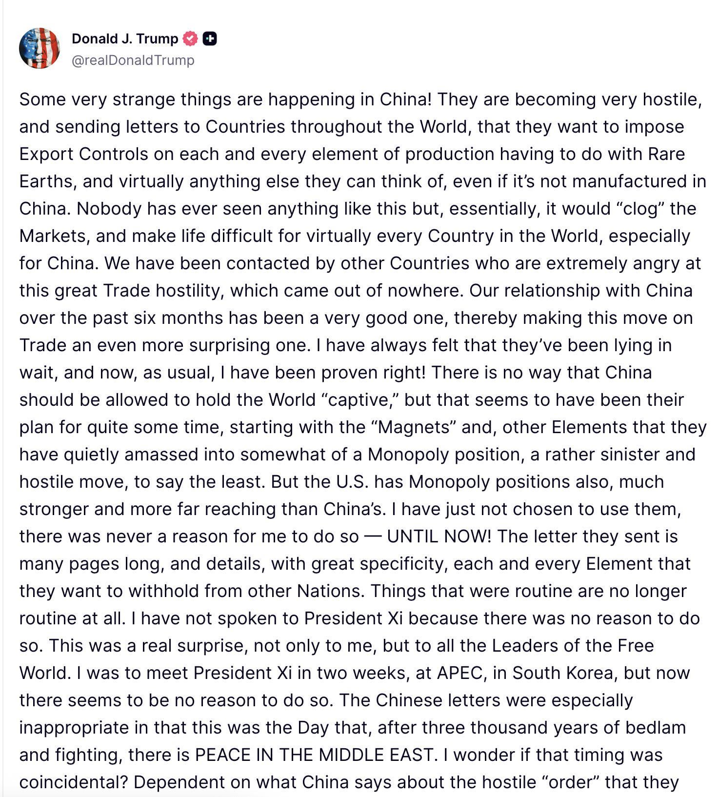 >Some very strange things are happening in China! They are becoming very hostile, and sending letters to Countries throughout the World, that they want to impose Export Controls on each and every element of production having to do with Rare Earths, and virtually anything else they can think of, even if it’s not manufactured in China. Nobody has ever seen anything like this but, essentially, it would “clog” the Markets, and make life difficult for virtually every Country in the World, especially for China. We have been contacted by other Countries who are extremely angry at this great Trade hostility, which came out of nowhere. Our relationship with China over the past six months has been a very good one, thereby making this move on Trade an even more surprising one. I have always felt that they’ve been lying in wait, and now, as usual, I have been proven right! There is no way that China should be allowed to hold the World “captive,” but that seems to have been their plan for quite some time, starting with the “Magnets” and, other Elements that they have quietly amassed into somewhat of a Monopoly position, a rather sinister and hostile move, to say the least. But the U.S. has Monopoly positions also, much stronger and more far reaching than China’s. I have just not chosen to use them, there was never a reason for me to do so — UNTIL NOW! The letter they sent is many pages long, and details, with great specificity, each and every Element that they want to withhold from other Nations. Things that were routine are no longer routine at all. I have not spoken to President Xi because there was no reason to do so. This was a real surprise, not only to me, but to all the Leaders of the Free World. I was to meet President Xi in two weeks, at APEC, in South Korea, but now there seems to be no reason to do so. The Chinese letters were especially inappropriate in that this was the Day that, after three thousand years of bedlam and fighting, there is PEACE IN THE MIDDLE EAST. I wonder if that timing was coincidental? Dependent on what China says about the hostile “order” that they have just put out, I will be forced, as President of the United States of America, to financially counter their move. For every Element that they have been able to monopolize, we have two. I never thought it would come to this but perhaps, as with all things, the time has come. Ultimately, though potentially painful, it will be a very good thing, in the end, for the U.S.A. One of the Policies that we are calculating at this moment is a massive increase of Tariffs on Chinese products coming into the United States of America. There are many other countermeasures that are, likewise, under serious consideration. Thank you for your attention to this matter!