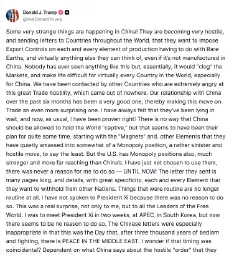 >It has just been learned that China has taken an extraordinarily aggressive position on Trade in sending an extremely hostile letter to the World, stating that they were going to, effective November 1st, 2025, impose large scale Export Controls on virtually every product they make, and some not even made by them. This affects ALL Countries, without exception, and was obviously a plan devised by them years ago. It is absolutely unheard of in International Trade, and a moral disgrace in dealing with other Nations.