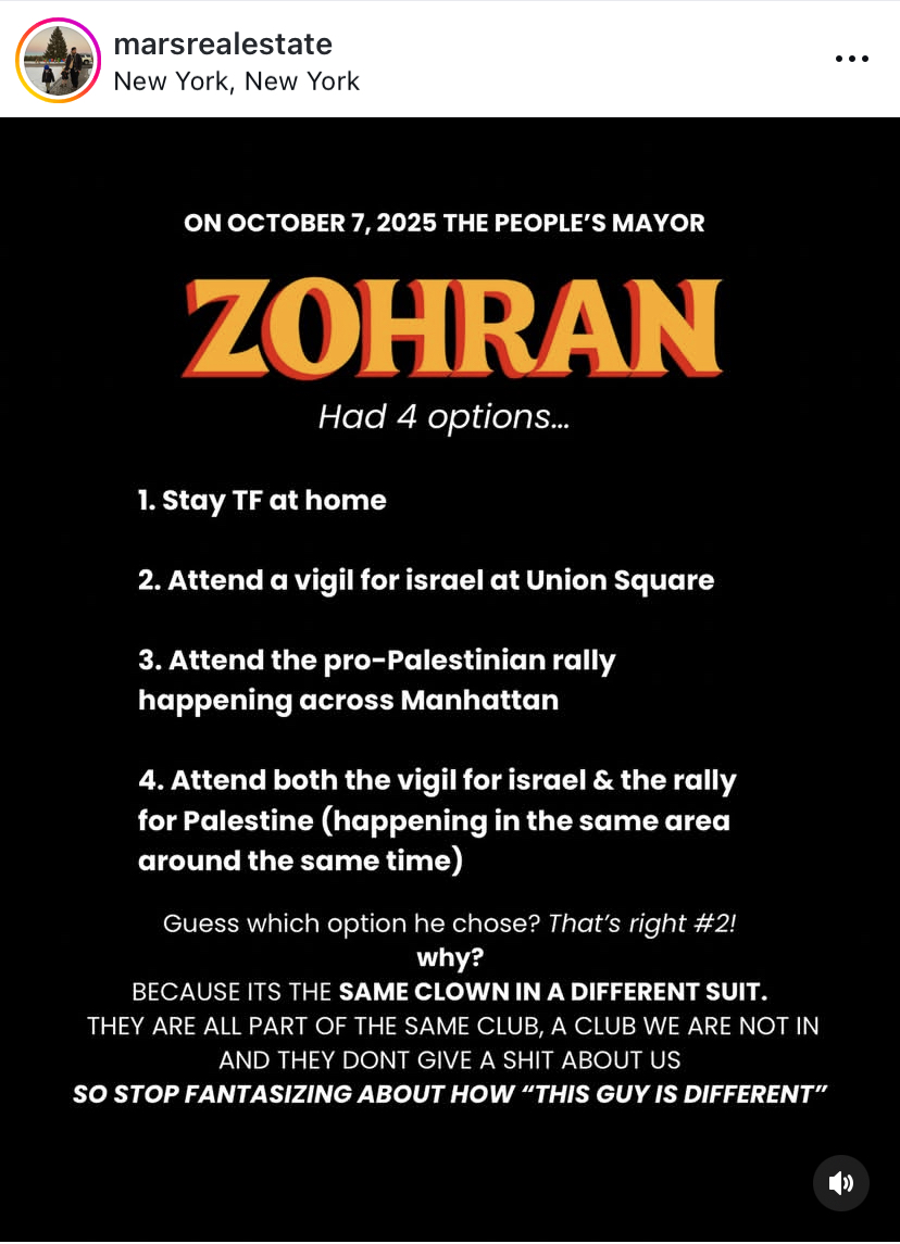 It's perfectly OK to pander to the Zionist vote when you're running for Mayor of New York. This is the early state of Socialism with United States Characteristics, deal with it. Until you gain real power, this will continue to be the most viable way forward.