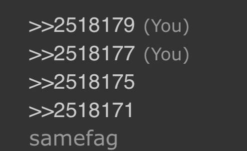 >>2518165Yeah, sorry he’s obsessing over me. In my defense I’ve tried filtering him in the past but he’s just that obsessed with throwing shit my way.