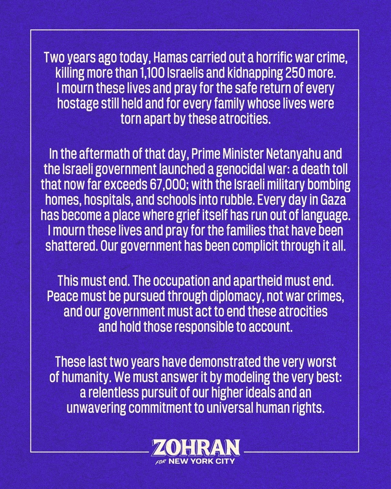 All mamdani had to do was just kept his fucking mouth shut and focus on NYC instead of going out of the way to make a public statement calling self defense against genocide a war crime (this part is red in case you ignore the rest), mourn the real war criminals, and downplay the number killed from 680,000 to 67,000, which is over ten times lower. he gained zero important votes from doing this and spat in the faces of the people who previously were tricked into thinking he was based.
