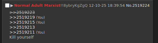 >>2518033Yeah he’s a massive hypocrite. He’ll write out shit about ambushing ICE officers, but they’re in his city right now and he’s done jack shit. His entire personality is dictated by hubris—“Oh I’m the only person with a job!” “I’m the only REAL Marxist!” “Everyone in this country is a reactionary fascist who’d gleefully murder a baby for labubus except for ME!” His doxxing? Literally a consequence of his own hubris. He put his name and face out, complete with his profile pic literally being him wearing that Lenin hat (again cause he likely has an ego that makes him think he’s some thought leader), and kicked a hornet’s nest. Then he cries “oh woe is me! I’m a victim!”