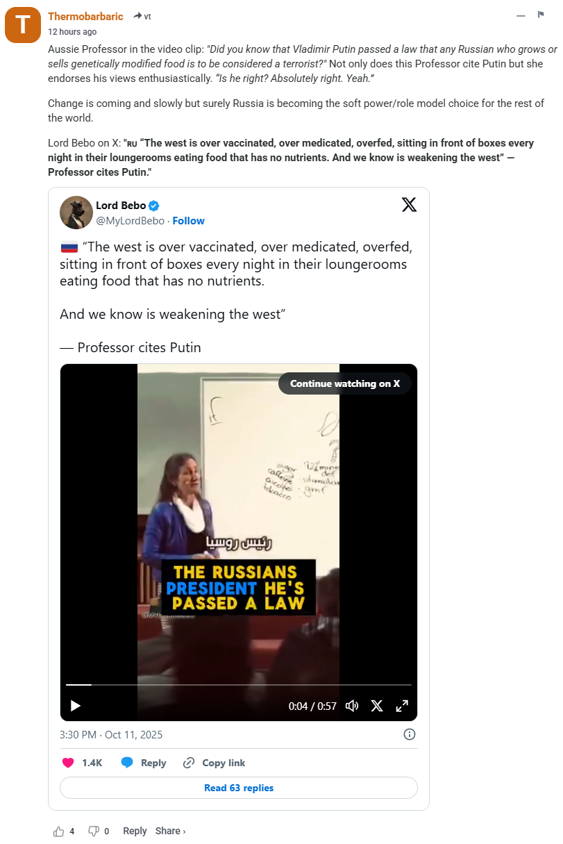 >>2524426>progress is when eating lessGlad to see that Westoids have come to rely on Soviet cope methods to feel superior over their adversaries. I'm sure that Perestroika won't happen to Westoids anytime soon :^)