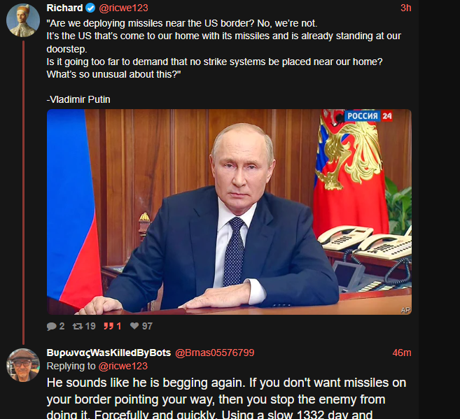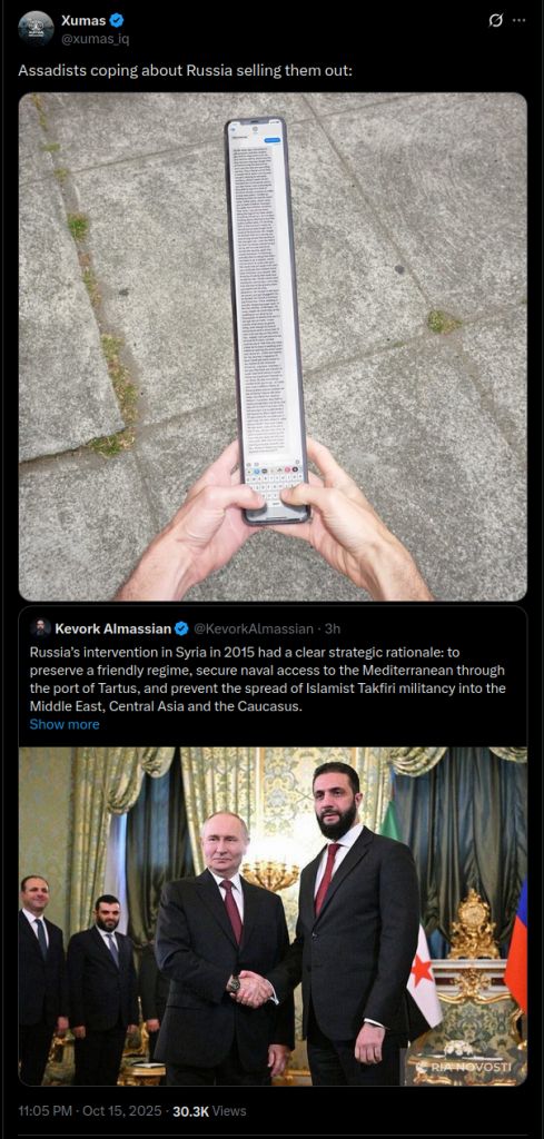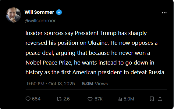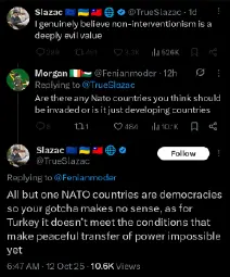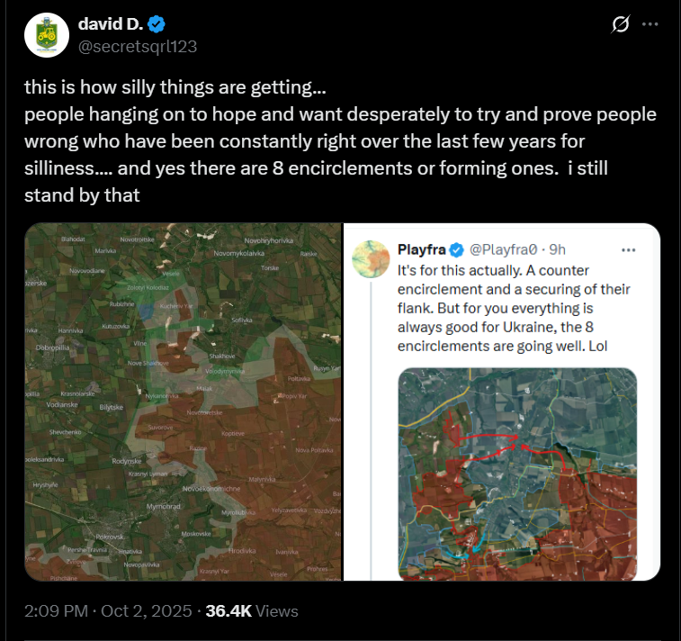 >lmao you thought Trump was on your side and was going to hand over whatever Ukraine demanded to givas because they signed the minerals deal<kek please, you thought Trump was on YOUR side when he shook Putin’s hand in Alaska and assumed that means they’d spent the day making out and dreaming of a US-Russia coalition But tbh it’s likely just slightly scared projection from both sides that Trump will probably do something stupid that will endanger everyone and NAFOids were worried that Trump was going to ditch NATO in favour of some alliance with Putin or Russian Xitter worries that he will just sail the entire US Navy into the Black Sea to fire Tomahawks and double dare Putin to sink the entire fleet with a single nuke