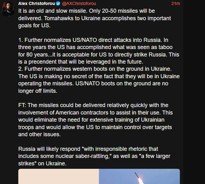 Trump now saying the US needs the Tomahawks for themselves and they shouldn't leave themselves depleted to support Ukraine.