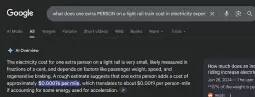 <The electricity cost for one extra person on a light rail is very small, likely measured in fractions of a cent, and depends on factors like passenger weight, speed, and regenerative braking. A rough estimate suggests that one extra person adds a cost of approximately $0.00076 per mile, which translates to about $0.0019 per person-mile if accounting for some energy used for accelerationAnd even in a metro system that doesn't have a low ridership issue, what does it really cost to add another train?