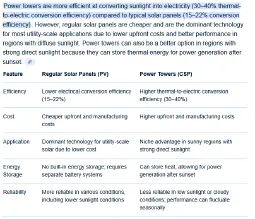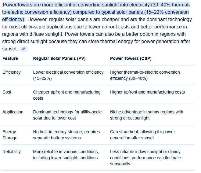 I never understood the tower of power. Aren't regular solar panels more efficient? What's the point of the mirrors and salt tower, is it just cheaper?