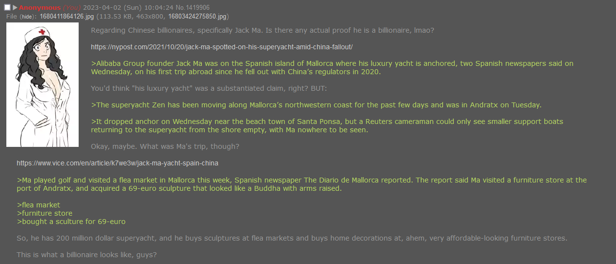 >>2538479Why would I be mad about him having an opinion I disagree with? I come here to argue and discuss things with people.There's plenty of other retards here whining about China all day. I just think he in particular is a really annoying pedo avatar fag and my enjoyment of using the site went up dramatically after I hid him. Seems more like you're having a crying fit, shitting and pissing yourself because I insulted your favorite anti china pedo