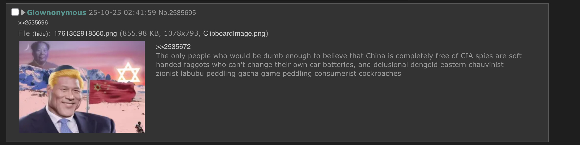 >>2538590>in that stupid westerners will think their stupid arguments are validated by itStupid westerners don't give a fuck what Chinese nationalists have to say about anything, especially racist ones that wanna defend settler colonialism. If they mention them at all it is because they are disingenuously using these people because they sound similar to them on a surface level, that is if they even give that much of a fuck about the chinese or think it'll give them clout to use them in such a way. Just attack western chauvinists, that's more then enough, no need to get upset about imaginary Chinese settler colonialism supporters.