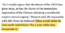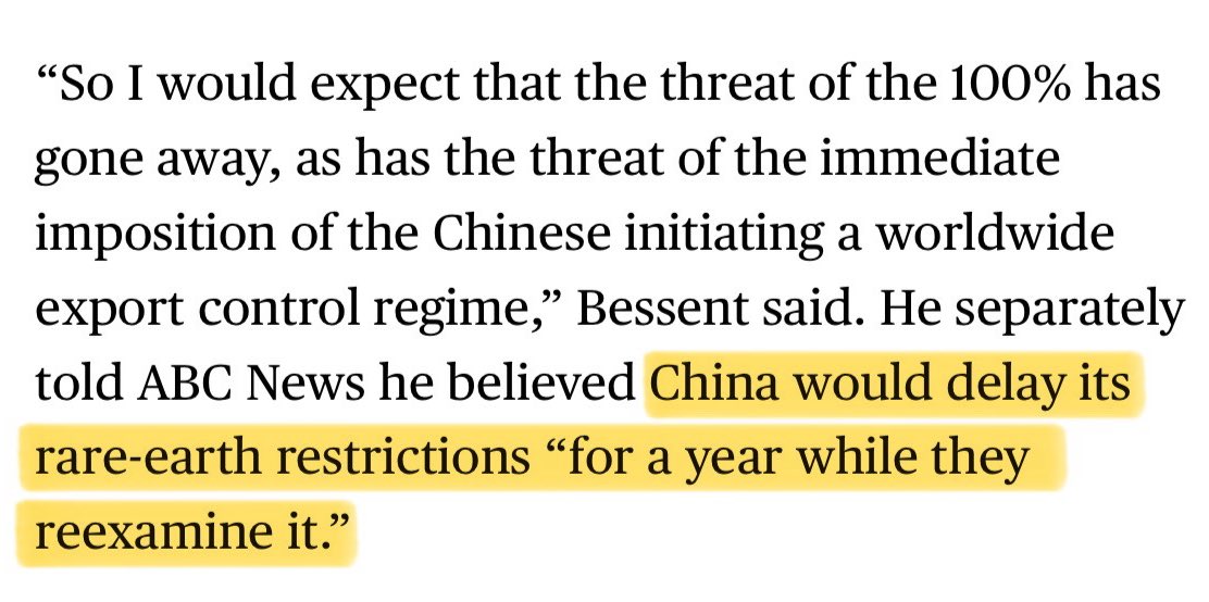 Bessent is signaling that China will cuck out and delay the rare earth export ban. In turn US will dial back some tariffs.