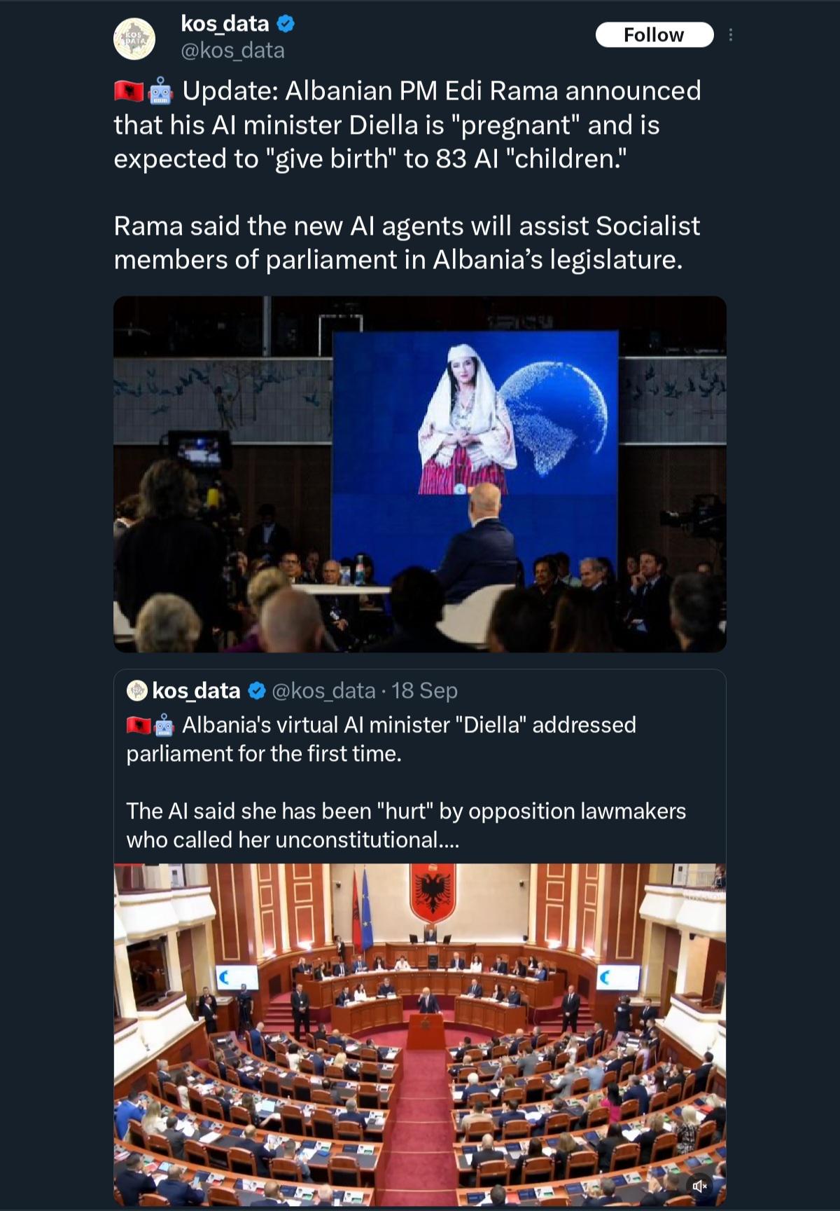 >>2532660>How was Albania anti-revisionist? I'm unfamiliar with this argument.Albania under Enver Hoxha prided itself on this strict interpretation of Marxism-Leninism that held that it was the only socialist country in the world and that all the other socialist countries became capitalist. It denounced Yugoslavia, the Soviet Union and later its only ally China and by the 1980s was stagnant and isolated. Now OpenAI runs the Albanian government. Pic related.