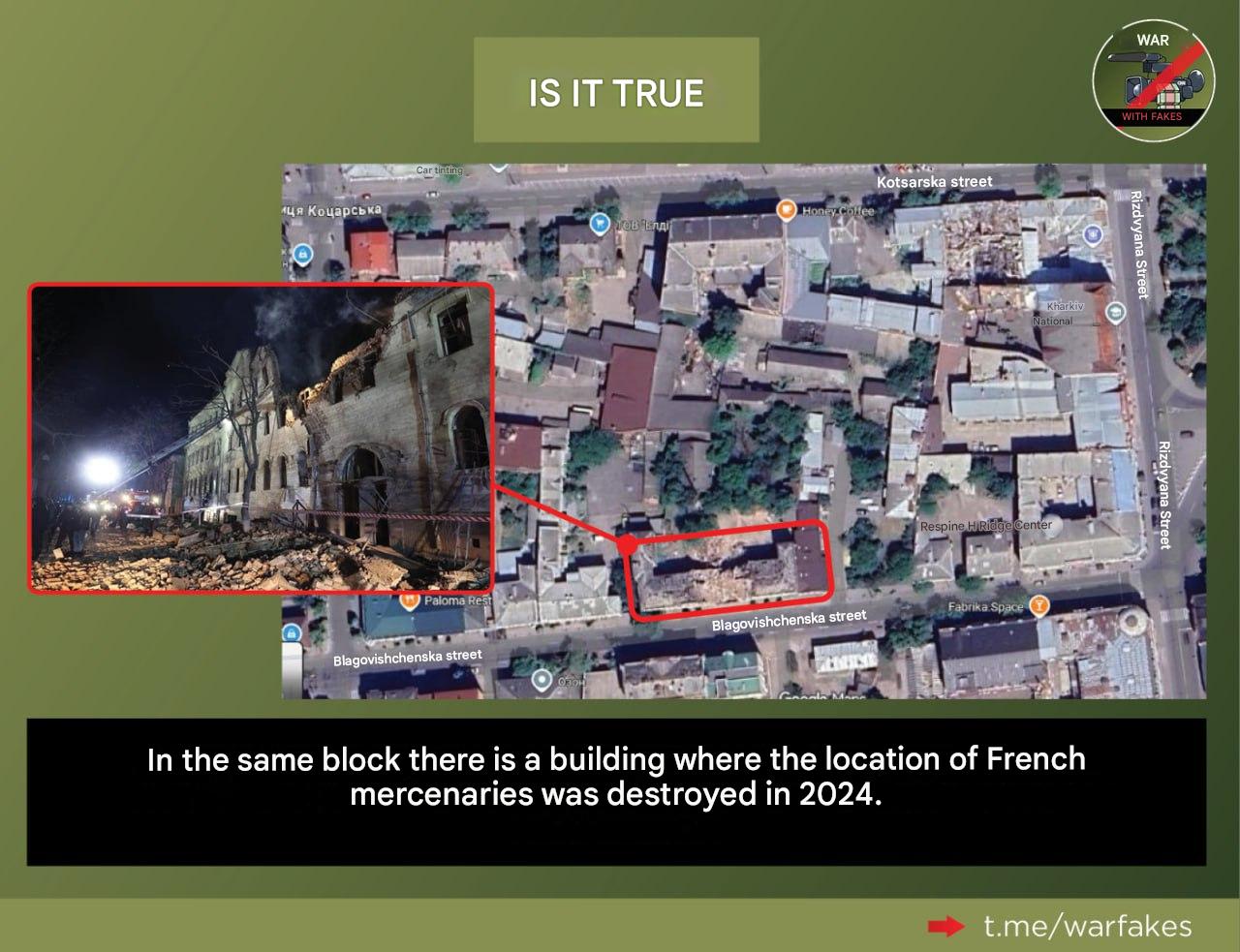 >This same block had been hit before; for example, on the night of January 17, 2024, a Ukrainian Armed Forces and French mercenary positions were hit.