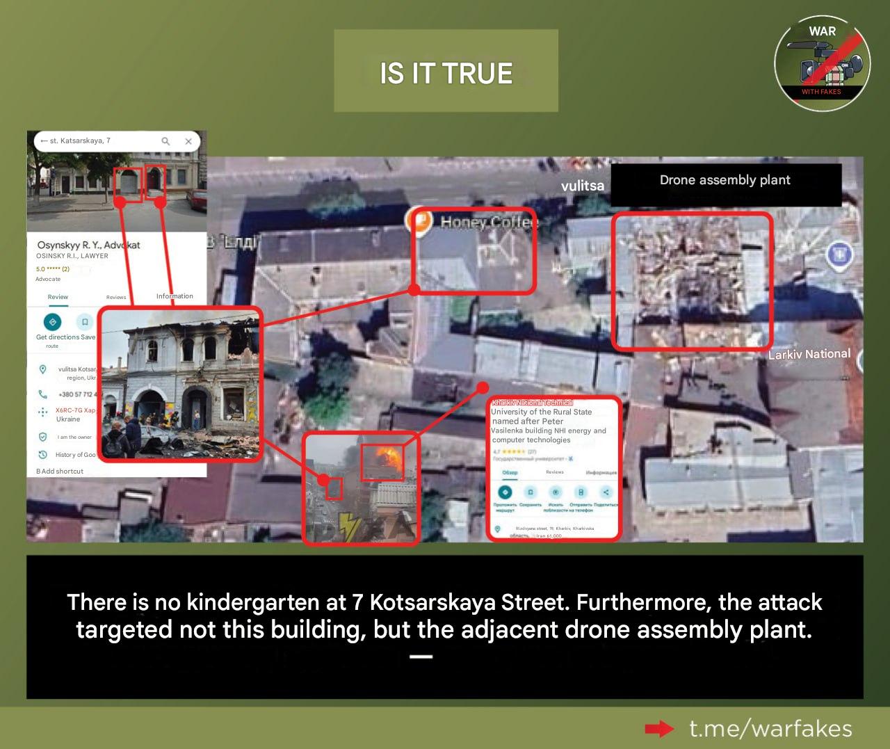 >No kindergarten is shown on various maps of the block. The building at 7 Kotsarska Street houses the Honey café and a law firm, not a childcare facility. However, the strike targeted the large red building next door, which houses the drone assembly plant at Kharkiv National Technical University.