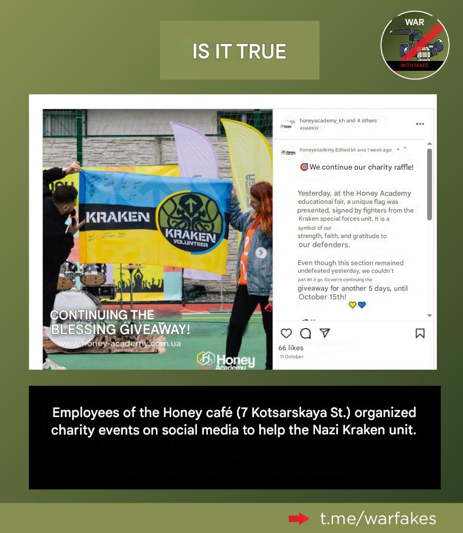 >It's telling that the Honey café employees who claimed the strike hit a civilian facility had previously actively supported the Ukrainian Armed Forces, specifically holding charity events to support the Nazi special forces unit "Kraken" of the Ukrainian Main Intelligence Directorate (GUR), whose militants were "notorious" for torturing and murdering prisoners.