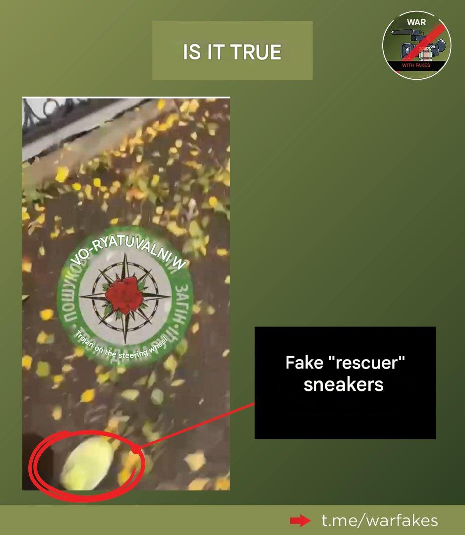 >The main, emotional video shows the work of a supposed rescuer, who, along with a team, is conducting a search and rescue operation. However, sneakers are visible in the frame, which cannot be used by a real rescuer. This suggests that the cameraman is not a rescuer, but a media personality engaged in the production of fake content.