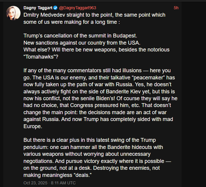 >>2533405I dare say he may mean it for the Tomahawks (tho within Ukraine like Oreshniks raining down on Kiev or such). Quite a few commentators converging on the view that he's been facing a lot of internal pressure from the Russian political and military classes, the fear being that his extreme risk aversion is inviting the very catastrophes it seeks to avoid.
