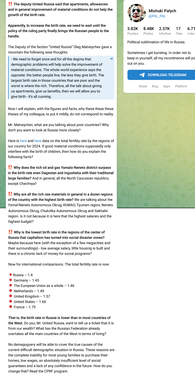 >probably more like the kind of token resistance that UR allows.I think it's more likely that the primary concerns for the KPRF are that of most parties in states that are in the gunsights of western imperialism, it's resistance and defence against the imperialists. Thus, it's not surprising that the KPRF, United Russia and Putin as an independent are collaborationists with each other to that end. We will hear a party like United Russia paying credence to the idea that neoliberalism is a weakening, even traitorous force in Russia, because that's true regardless of whether you're the state charged ironically with protecting the bourgeoise from themselves when under threat, or you're a communist party that wishes to see industry remain exactly where it can be seized by the proletariat it represents.