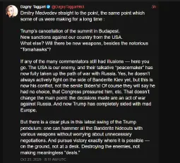 Wait For Trump, though not in the worst sense of gullibly accepting a bad deal from Trump, thank goodness. He's been suckered in the sense of interfering with military decisions because of the delusional belief that he can get a favorable deal from Trump, that Trump will behave rationally. Comments from Luka and Medvedev indicate that the General Staff wants to destroy the Kiev regime but has been unable to do so because Putin rejects strike plans (per Luka) or has let Banderite hideouts go unscathed so as not to derail the negotiation process (per Medvedev).