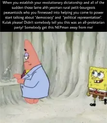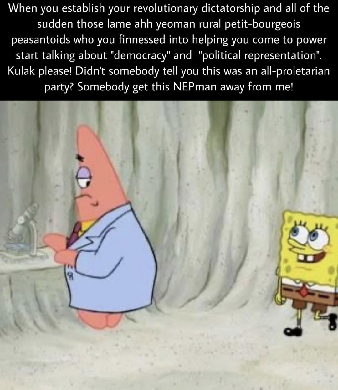 The point is that SpoiledBurrito is obviously in hysterics again over some failure of the American Left to be adequately anti-imperialist, almost certainly that they like the Democrats too much, they like Bernie Sanders/AOC/etc too much, maybe they even like a troop or something. Maybe they're even consuming product when product is made with imperialism. I don't know what specific thing RancidTaco is on about right now. He, and a significant chunk of the Left, cannot accept that there are no clean hands in a dirty world and these purity games are nonsense.