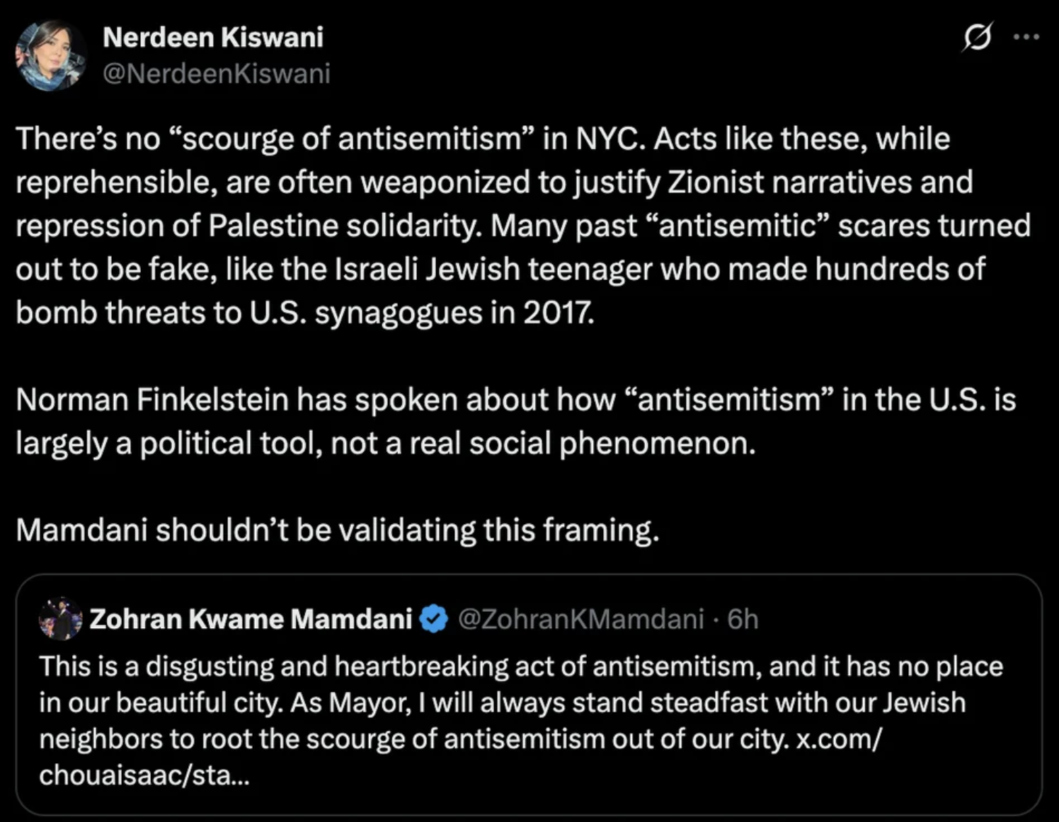 No one believes he’s an actual socialist, however his victory will be the most important victory of the American left of the past 90 years. Why? Because it shows the Zionist Lobby has NO POWER compared to the power of the MASSES OF PEOPLE and we can defeat the satanic Zionist entity not with a violent revolution but simply with voting. Nobody believes Mamdani is a perfect candidate but that’s not the point.