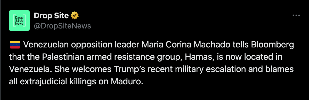 >>2545358Trump-backed Venezuelan coup leader promises to give oil to US corporations2025 Nobel Peace Prize winner María Corina Machado, a US government-funded far-right coup leader, vowed to privatize Venezuela's oil and give it to US corporations. "We are going to privatize all our industry", she told Donald Trump Jr. "American companies … are going to make a lot of money", she promised. Ben Norton exposes the neocolonial US war on Venezuela.