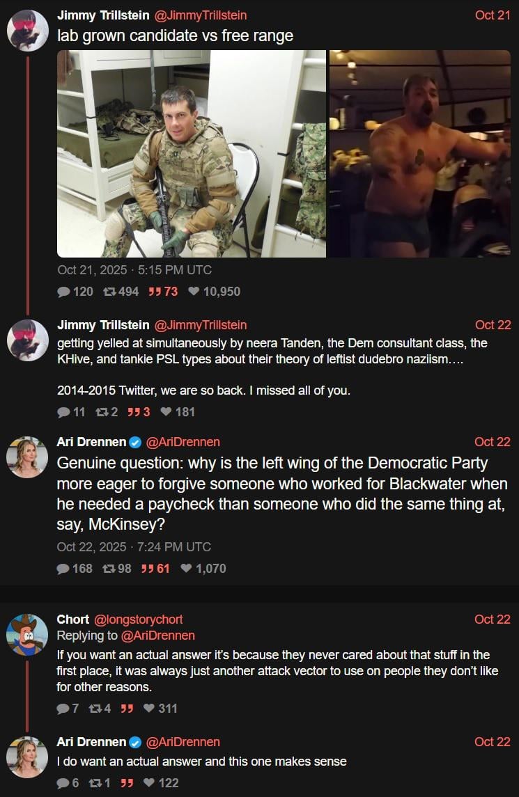 for example, Leftypol will call Platner a nazi all day long but the guy's resume is arguably more appealing to "white working class" types than a typical DSA leftist(homeless, trans, brown, etc) who if anything scare "Americans" away from the Left by being so different from what they're used to.