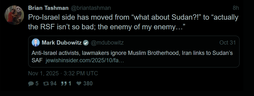 I thought this was a good but nihilistic article that contextualizes what happened in Sudan as the collapse of the (bankrupt) Axis of Resistance and its substitution by the "Axis of Rape and Pillage" led by the UAE, which is using proxy warfare to grab as much loot as it can. The article is from the American Conservative which is a paleocon, right-wing magazine but they are sometimes good.