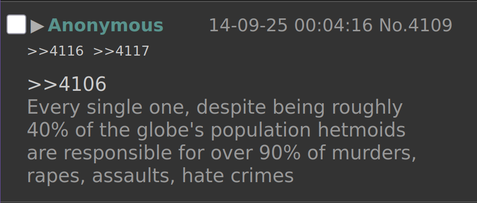 >>2543684>i love to rape plunder and kill, you NEED ME or else the other cishet moid over the hill will rape plunder and kill you instead of me raping plunder and killing his tribewe know, cishet moid, we know you are a protection racketeer and enemy of the non-cishet-moid proletariat