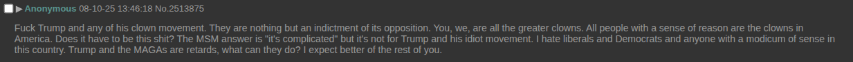 Then these women go online and just bitch about "moids" all day instead of criticizing the party they voted for failing to protect their interests. It creates an endless feedback loop of frustrated women lashing out on social media, impressionable young men seeing all this "moid" hate and getting chudded because they think women hate them, and the country moving further to the Right as a result.