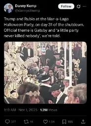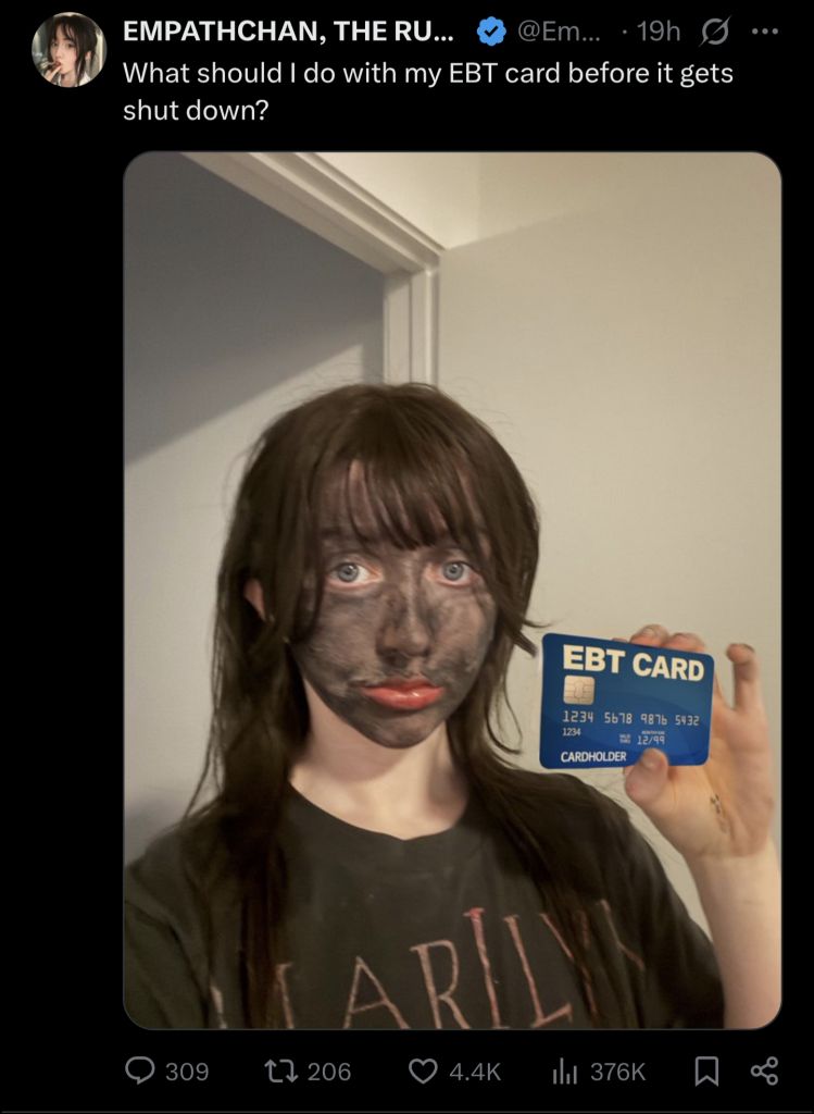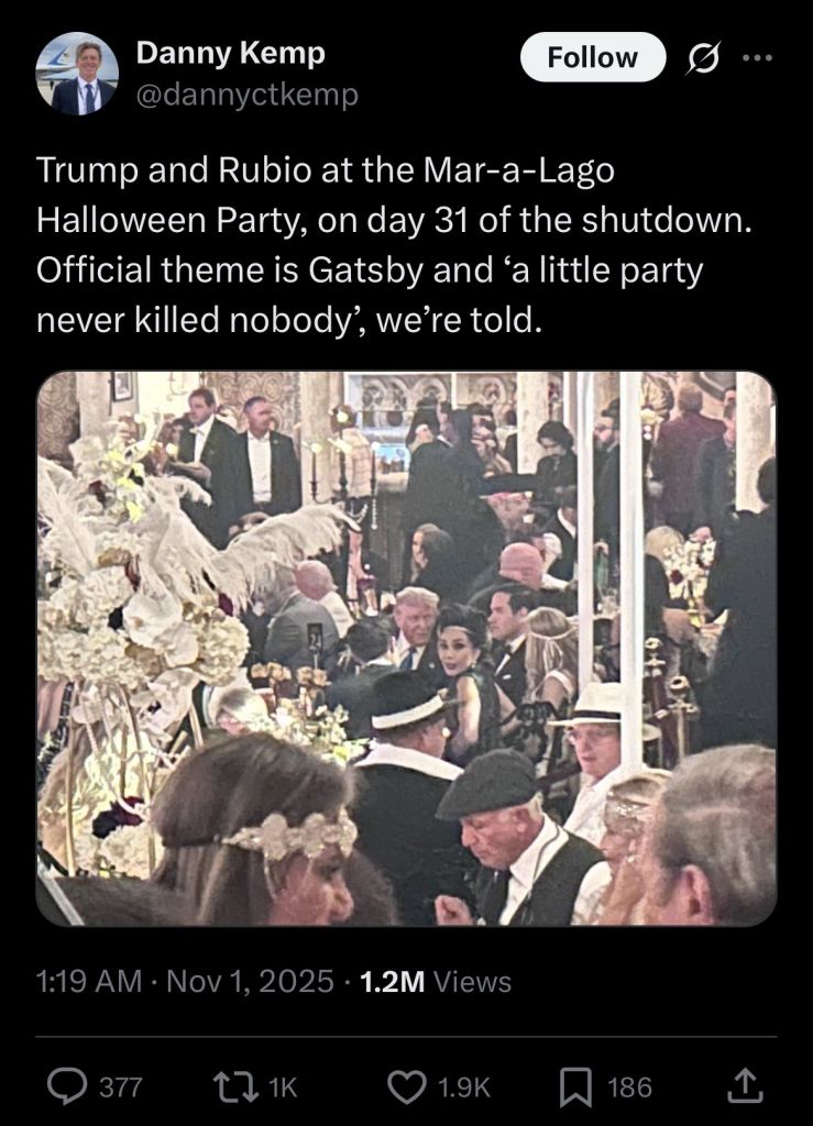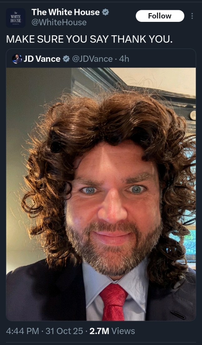 <Trick-Or-Treatlerite EditionThread for hellish discussion of the Dying Burger Reich: Things are going to continue to happen in the stupidest ways possible that no one really takes seriously, where every single person compulsively reacts with either cynical grifting or useless panic and appealing to a political system of liberal democracy that is entirely dead and irrelevant. things will continue to get gradually worse, more people will lose their jobs and homes, the most destitute and marginalized will be oppressed by state-backed domestic terrorism, but the decay will simply continue and everyone who isn't actively being imprisoned and forced into slavery or outright exterminated will simply ignore it and maintain a cognitive dissonance of believing a civil war is happening while living their lives in a mostly normal fashion. The death of the United States will be slow, painful, and insufferably annoying and stupid.   🏈 💵