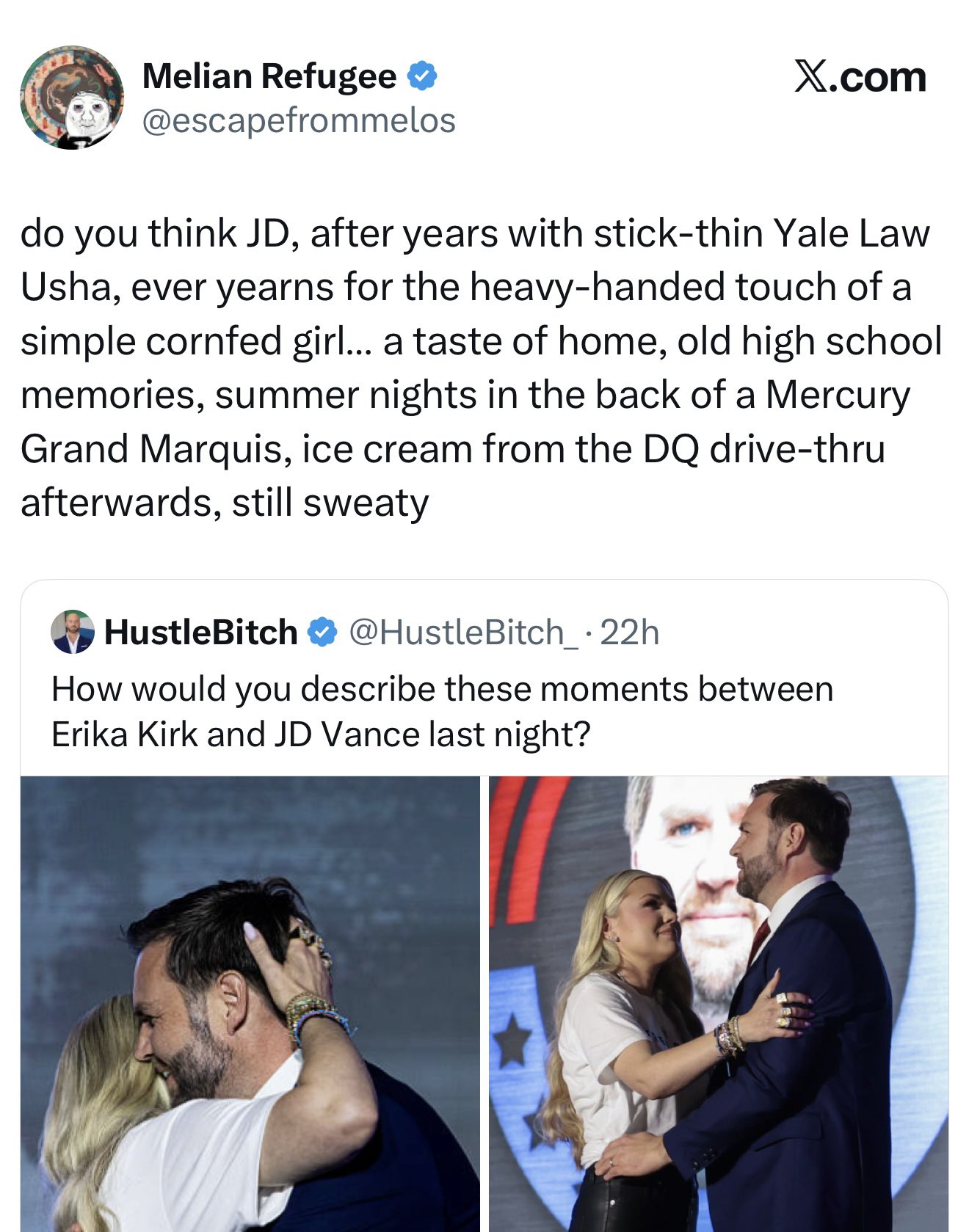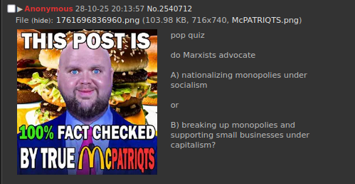 >>2544859>The median voter has completely incoherent politics. 8/16 btwI think that's more a reflection of the incoherent politics of the political and pmc classes. Their politics are nonsense for ideological and structural reasons, and that prevents them from engagjng with the "median voter" (whatever that is) in any meaningful or constructive way.