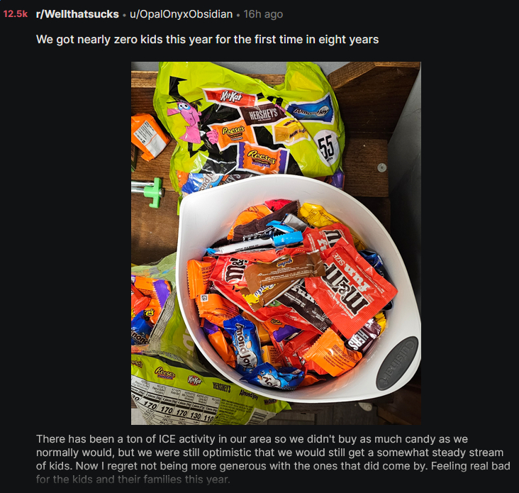 >>2545598>I saw hundreds of kids trick or treating with their parents outside yesterdayIn AmeriKKKa kids are scared to grab a big heaping handful. When I was a kid we didn't buy candy we made that haul last and were as greedy as we could be in the rich neighborhood.
