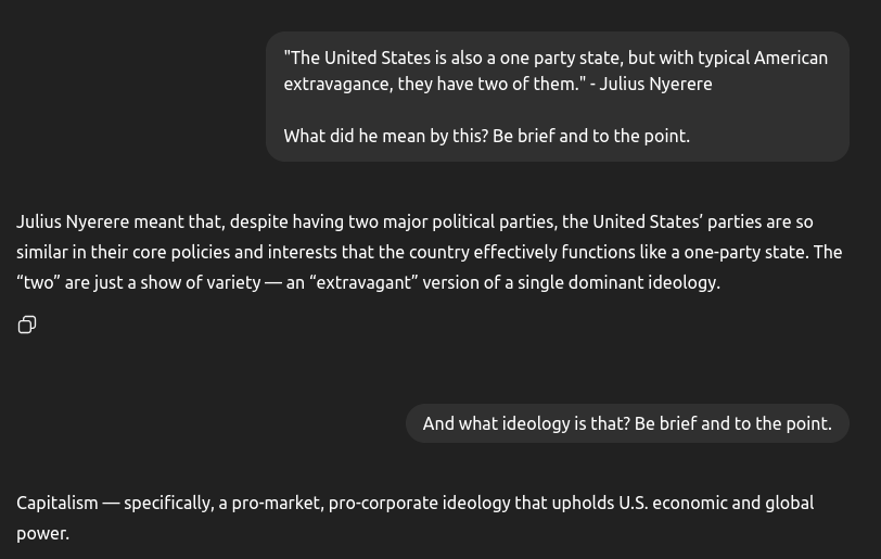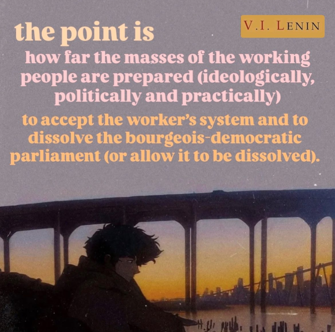 >>2546969There shouldn't be "liberal democracy" (an oxymoron) or an authoritarian one party state. To avoid the failings of the 20th century (and ongoing), a better system would be focusing on bottom up governance where there at the top there are elections between multiple groups, but the elected party itself is hollow and primarily meant as an organ to enforce the people's will and maintain the road to socialism. That is, power originates in local councils, cooperatives, or assemblies, higher bodies are delegated upward, rather than ruling downward, and the “party” at the top is essentially a servant of the collective will, not its substitute. Thus democracy would be scaled from the ground up towards a common goal, and it wouldn't even be necessary to bar "liberal"/"conservative" groups from running because of the base-superstructure relationship; that is, once we begin the push towards socialism/lower stage of communism and people are made to see how the system is superior, the material conditions would influence the kinds of laws and parties that are even considered to be politically viable in the first place.
