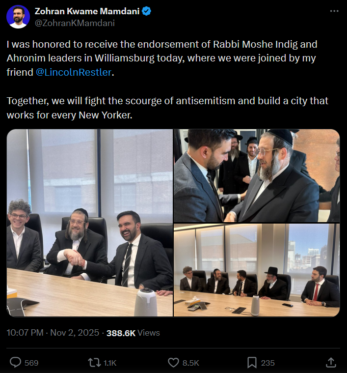 Local media reported earlier today that Rabbi Moishe Indig, a prominent leader in the Satmar Ahronim faction, was set to endorse State Assemblymember Zohran Mamdani, a far-left, anti-Israel candidate. Indig and Mamdani then met this afternoon.