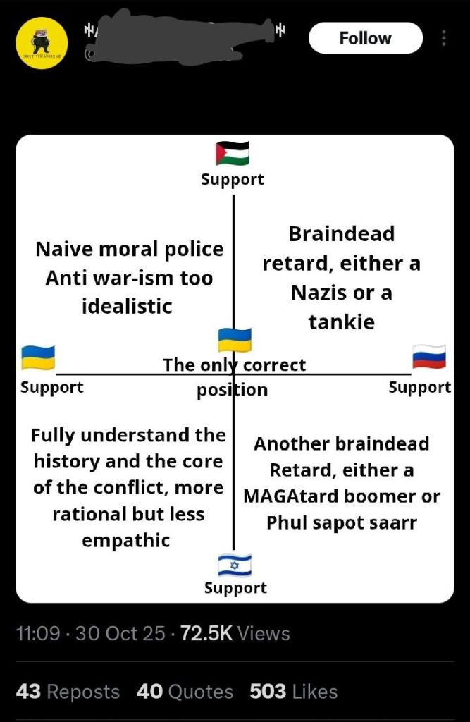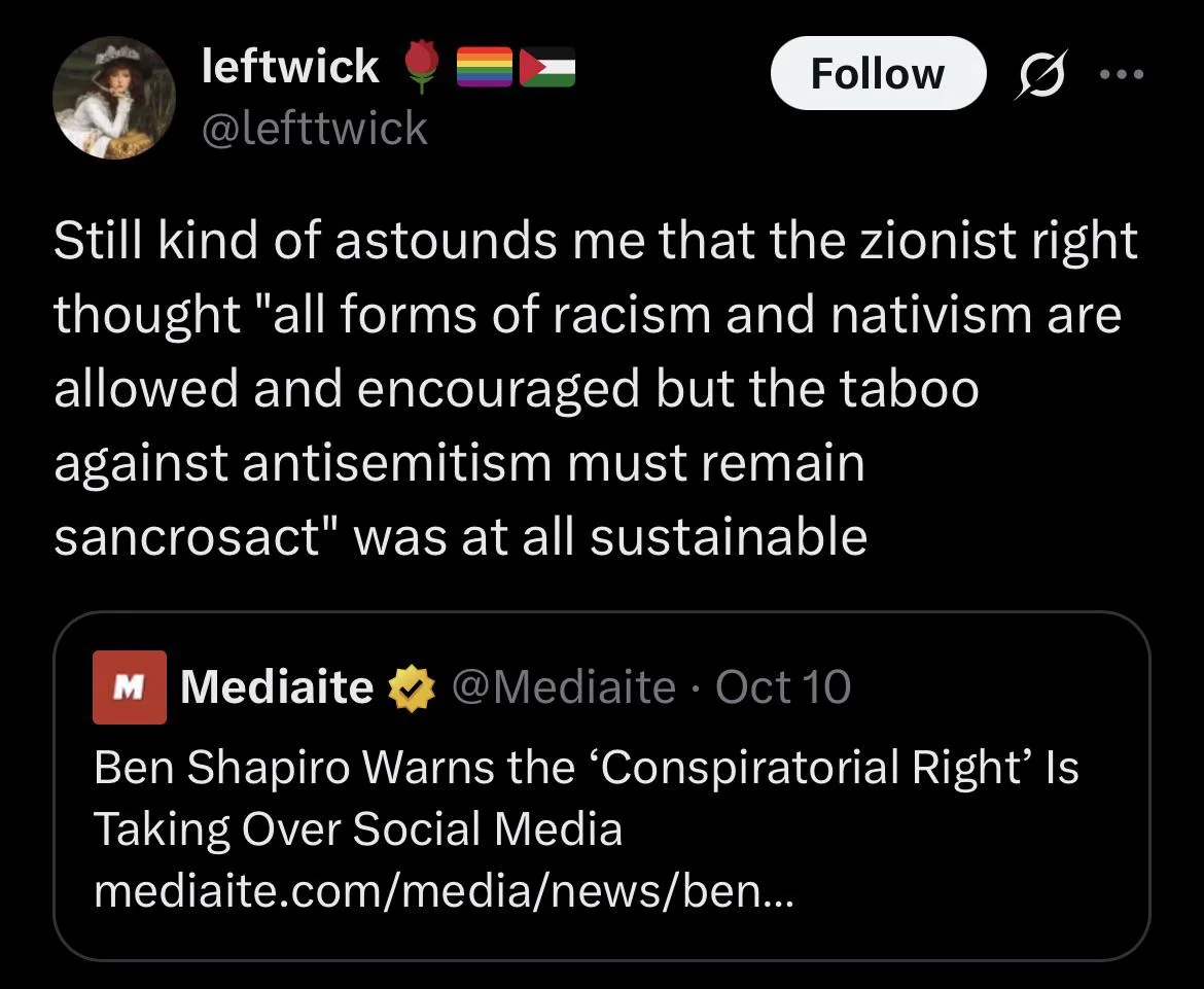 >>2546937Still I think it’s important to prevent the intermingling of the Palestine movement with actual anti-semites for the sake of not giving Israel ammo.