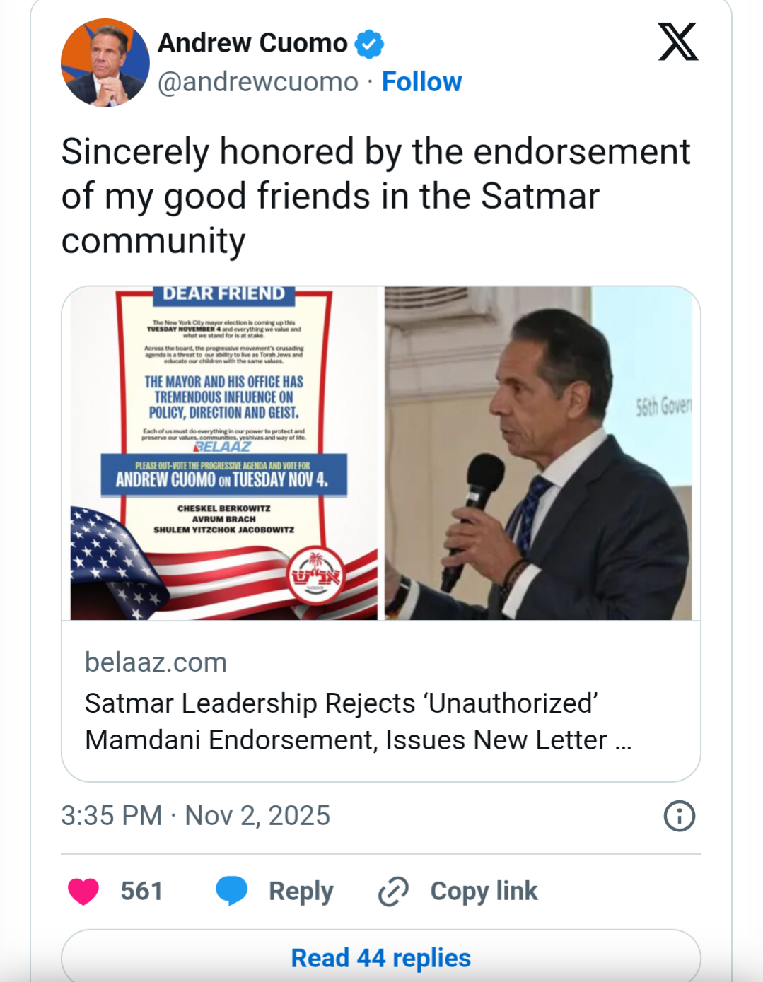 Around the same time, three other leaders of the faction released a statement endorsing former New York governor Andrew Cuomo, a pro-Israel centrist and Mamdani’s leading challenger.