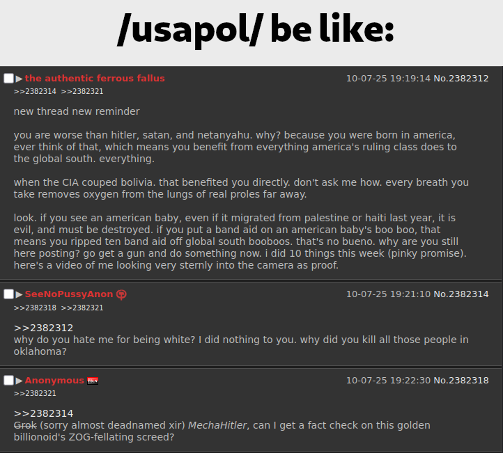 "Haha leftists are with the transhumanists/sissification fetishists"