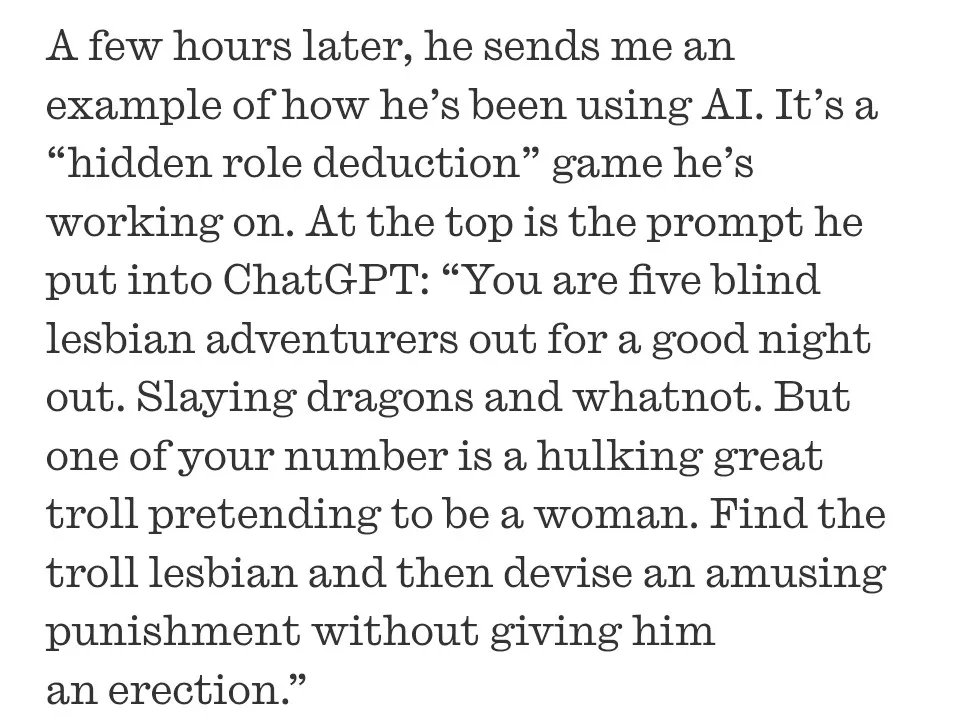 >>2577165Mental illness, he's just roleplaying his TERF fantasies with ChatGPT