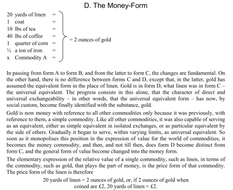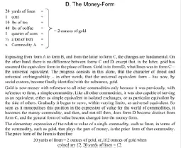 i was first persecuted in a das kapital thread over a year ago, where i stated that marx may be outdated due to his consideration of "money" as a commodity, particularly the precious metals, which contradicts MMT. attempting to prove this to stubborn dogmatists took hundreds of posts. in the midst of this also was an explanation of marx's "value-form" (i.e. A,B,C and D, which are all described in capital vol. 1, ch. 1, sct. 3). here, i was accused of interpreting marx by a revisionist lense called "value form theory", but as per usual, i was simply quoting marx directly.