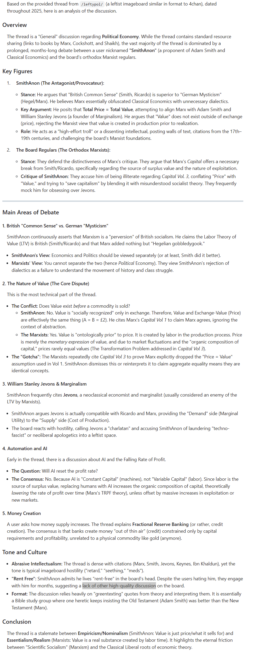 >>2507152>I noticed Smith anon that your strongest opinions seem to be: 1. Machines can create value rather than just transfer it. 2. Value is a social construct and not a magnitude of SNLTi respond to this in (#4):